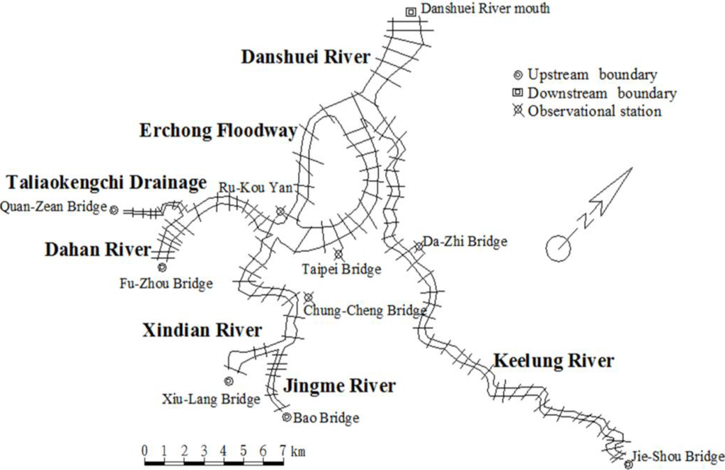 The Danshuei River system layout for the flood routing hydrodynamic model simulation and boundary conditions.