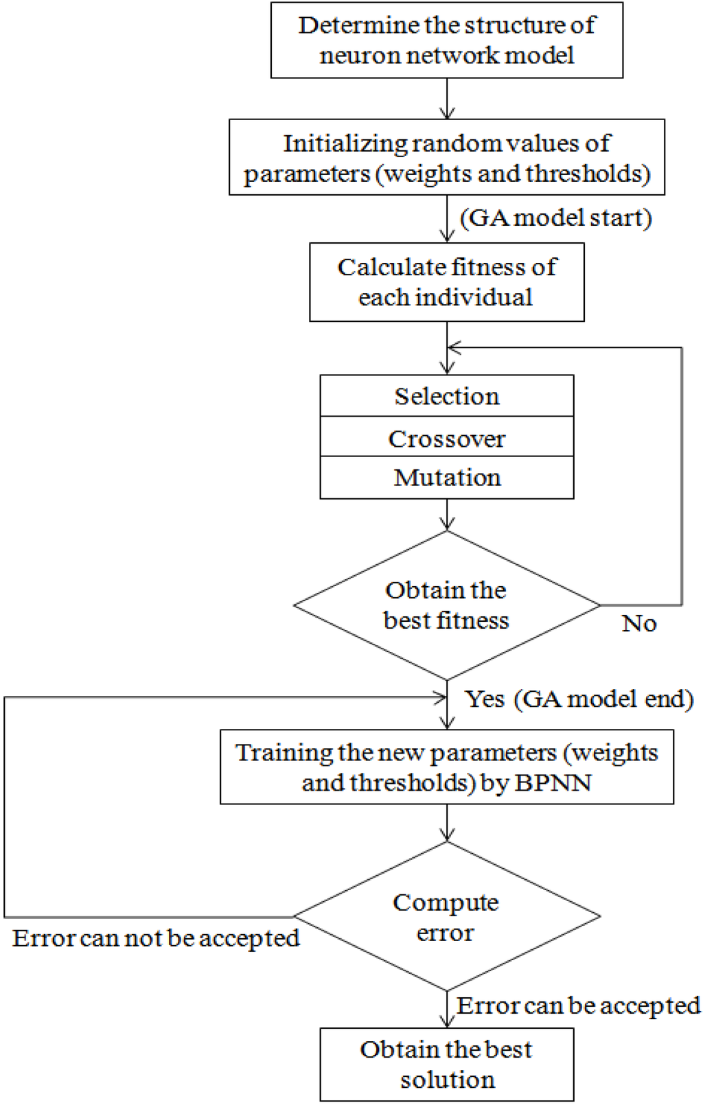 ANN training methods provide a non-linear mapping between inputs and outputs and are extremely useful in recognizing patterns in complex data. Methods, such as back-propagation (BP), have been improved with the genetic algorithm technique (GA). The training starts with GA, which executes a global search on the net weight range, refining an initial random set of weights to yield a better value, most likely closer to the global optimum. The BP algorithm then progresses the training, refining the solution provided by GA to approach the optimal solution.