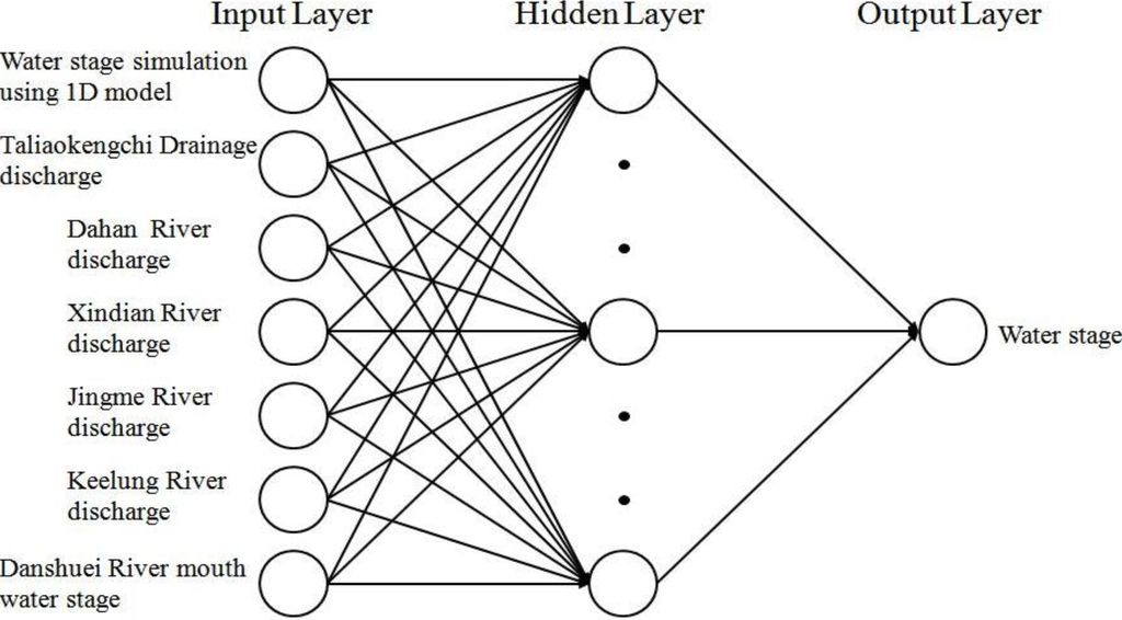 Because of the poor accuracy in simulating the water stage using the one-dimensional flood routing hydrodynamic model, ANN models, including BPNN and GANN, were employed to improve the water stage calculations. The BPNN structure for predicting water stage is shown in Figure 5. The input layer includes the water stage simulated by the one-dimensional flood routing hydrodynamic model; the upstream discharges of the Taliaokengchi Drainage, the Dahan River, the Xindian River, the Jingme River and the Keelung River; and the water stage at the Danshuei River outlet. The output is the predicted water stage at the gauge stations.