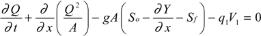 where, A is the cross-sectional area; Y is the water depth; Q is the discharge; q1 is the lateral inflow per unit channel length; S0 is the channel bottom slope; Sf is the friction slope; V1 is the longitudinal velocity component of the lateral inflow; g is the gravitational acceleration; t is time and x is the distance along the channel. Because the cross-sectional area can be written as a function of water depth, only two flow variables, Q and Y, must be solved in Equations (1) and (2).