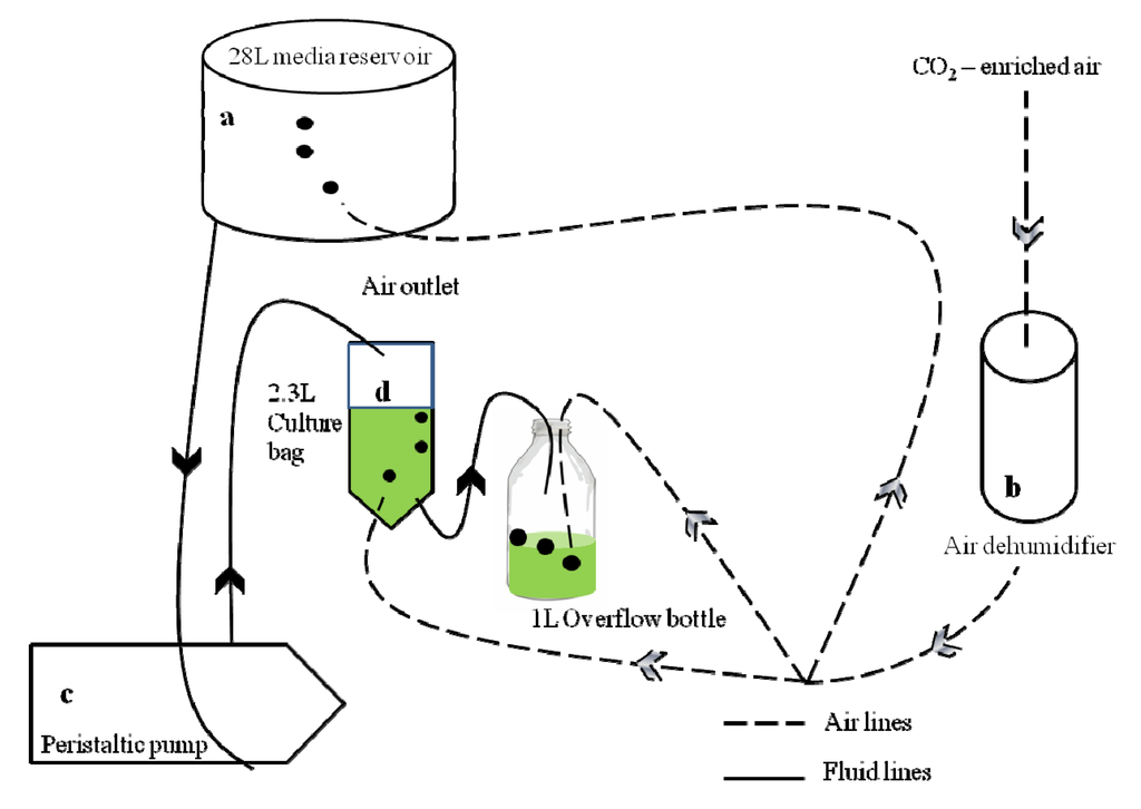 Overview schematic diagram of the ocean acidification continuous culture system. For simplicity only one CO2 treatment and culture bag is shown. (a) Eight 28 L media reservoirs supplied the cultures with media of the respective pCO2. The reservoirs were continuously bubbled with CO2-enriched air of the respective concentration; (b) Air bubbling through the reservoirs and all culture bags and overflow bottles was first dehumidified by passing through a silica-gel filled cylinder fitted with an activated charcoal stage at the end to remove any organic contaminants; (c) Peristaltic pumps delivered the media from the reservoirs to each culture bag at a rate equivalent to the growth rate of the culture; (d) Culture bags and overflow bottles were continuously bubbled to maintain stable carbonate chemistry. At the same rate as media was pumped in, culture overflowed into a sterile overflow bottle, which was sampled for subsequent biochemical and other analyses.