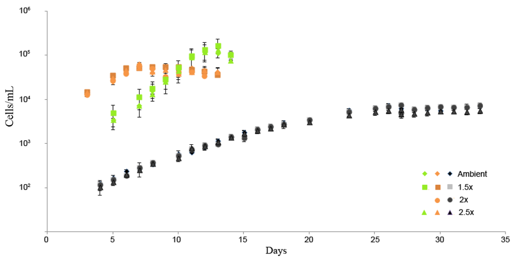Growth rates were not affected by CO2 concentrations in any of the three species (Figure 2). Based on the exponential growth phase prior to culture dilutions, growth rates of our cultures were: