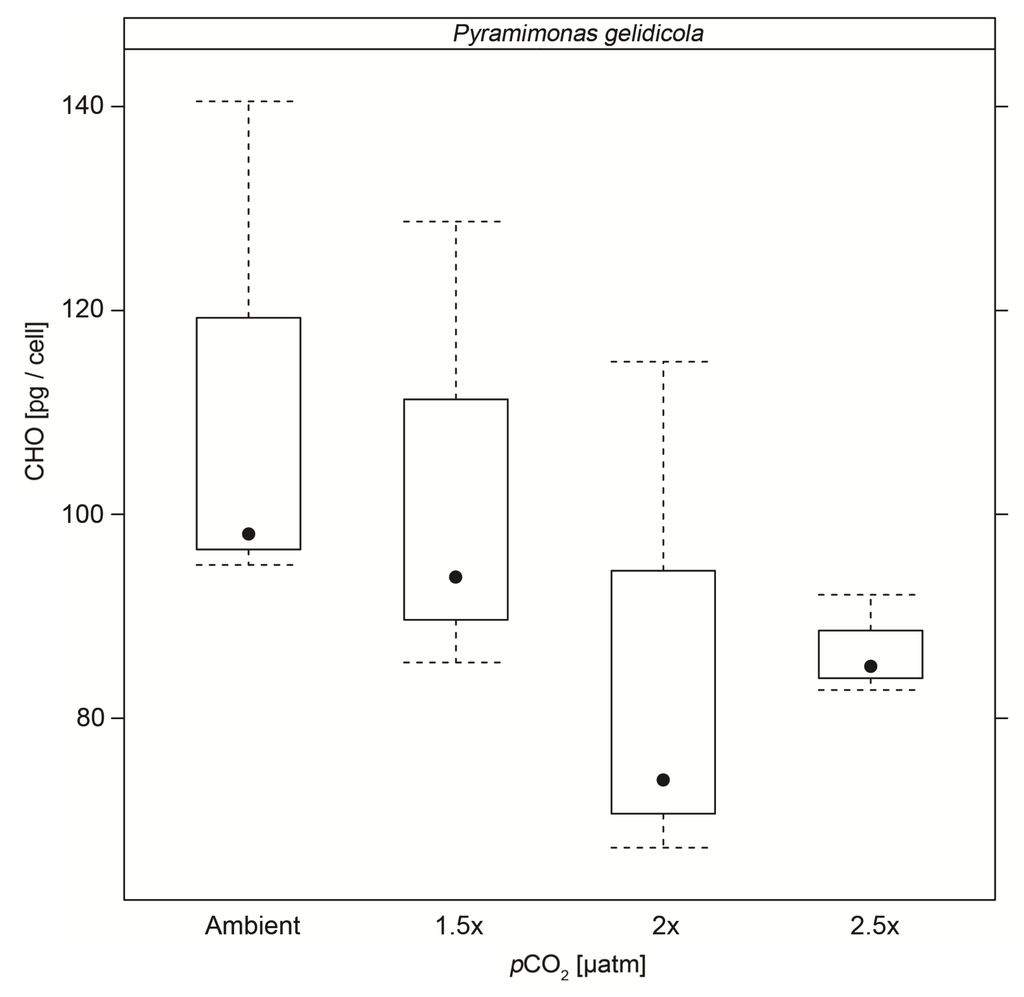 Cellular carbohydrate content of the prasinophyte, Pyramimonas gelidicola, and the haptophyte, Phaeocystis antarctica, cultures showed significant changes under elevated CO2 concentrations. In agreement with the findings of Thornton [36], who studied the marine diatom Chaetoceros muelleri, cellular carbohydrate contents of Pyramimonas gelidicola, cultures decreased about 22% under 2× (pH = 7.75) and 2.5× (pH = 7.67) ambient CO2 concentrations, compared to a ~20% decrease at pH 7.9 reported by Thornton [36]. Extracellular carbohydrate content was not measured in our experiment, thus we cannot exclude the possibility of excess carbon being accumulated and excreted as transparent exopolymers or low molecular weight carbohydrates in Pyramimonas gelidicola cultures, as suggested by Engel [70] and Thornton [36]. Cellular carbohydrate content increased by ~30% in Phaeocystis antarctica cultures at 2.5× ambient pCO2 (pH = 7.67). This is a larger increase than the 23% increase in cellular glucan content, a storage carbohydrate, reported in the marine diatom Skeletonema costatum grown at pH 7.5 [71]. Taraldsvik and Myklestad [71] manipulated the pH of the growth medium via addition of acid/base in contrast to the use of CO2 as occurred here, which might explain the difference in the magnitude between our result and theirs. This opposing trend in cellular carbohydrate contents between our two species highlights the importance of analysing the changes in both particulate and dissolved carbohydrates in future studies to identify the fate of C in the cellular and extracellular C pool. It also highlights the possibility that different phytoplankton types respond differently to increased CO2 concentrations. However, as the results by Thornton [36] and Taraldsvik and Myklestad [71] show, even within the same phytoplankton types, in this case diatoms, opposing response to CO2 has been found.