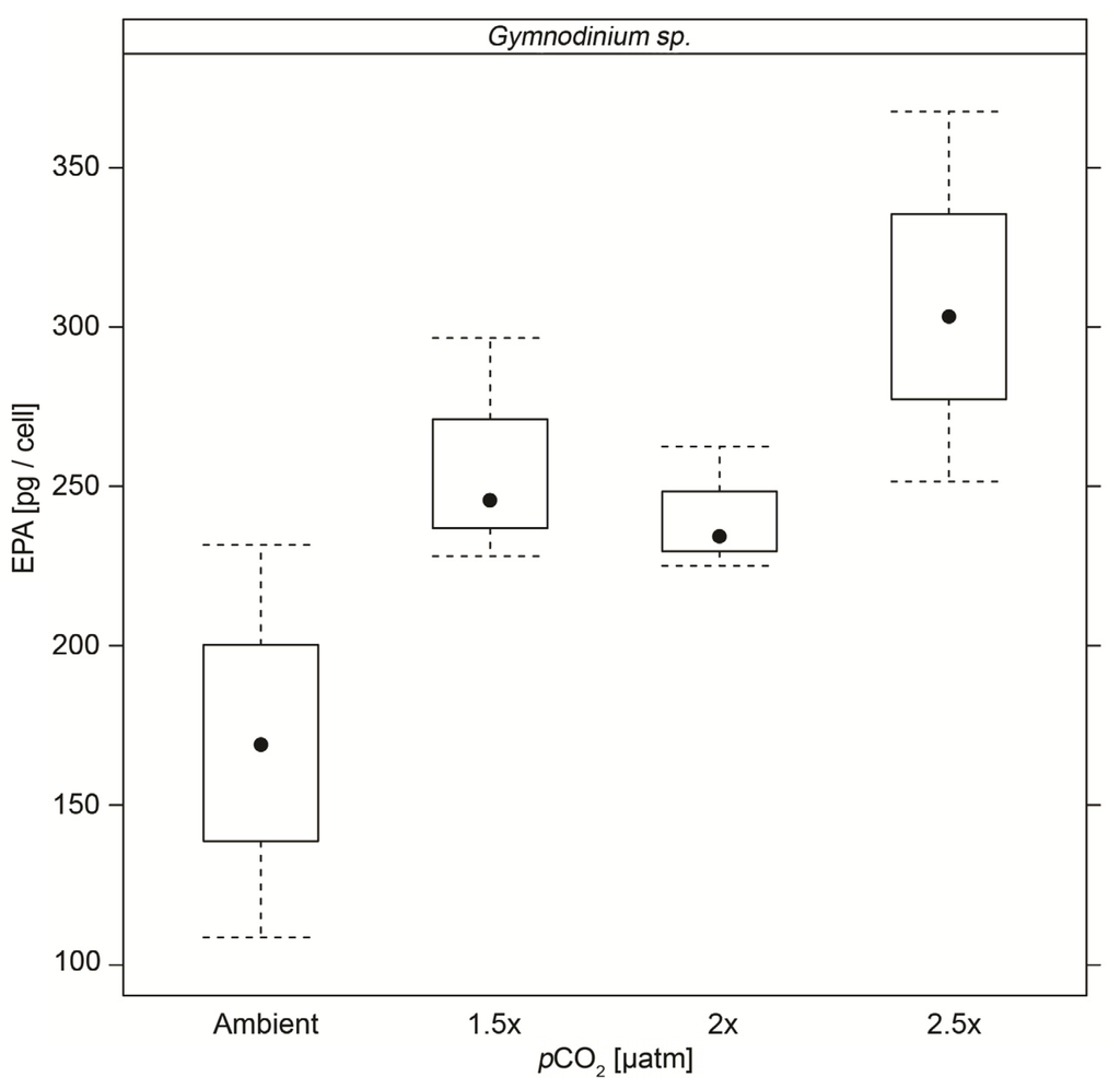 Except for EPA contents in Gymnodinium sp. and carbohydrate content in Pyramimonas gelidicola, we could not detect a CO2 signal across all CO2 concentrations, and often only found significantly different biochemical contents in the highest pCO2 cultures compared to control cultures. As noted above, this could be due to noise in the data due to low replication, which only allows strong differences to be statistically significant. However, the chance of false positive results also increases with the number of parameters that are tested for. Increased replication and possibly reduced experimental temperatures are therefore recommended for future research.