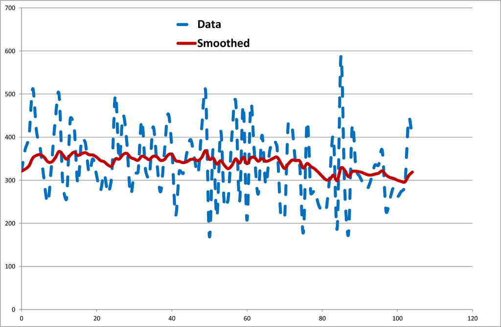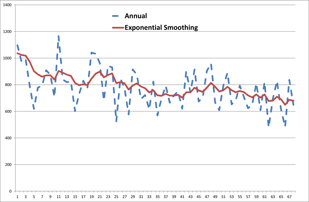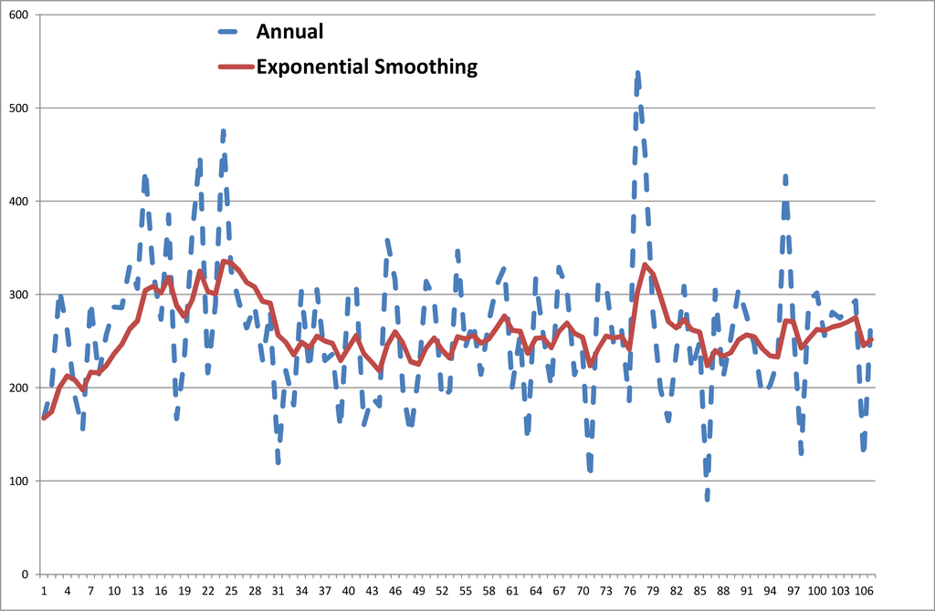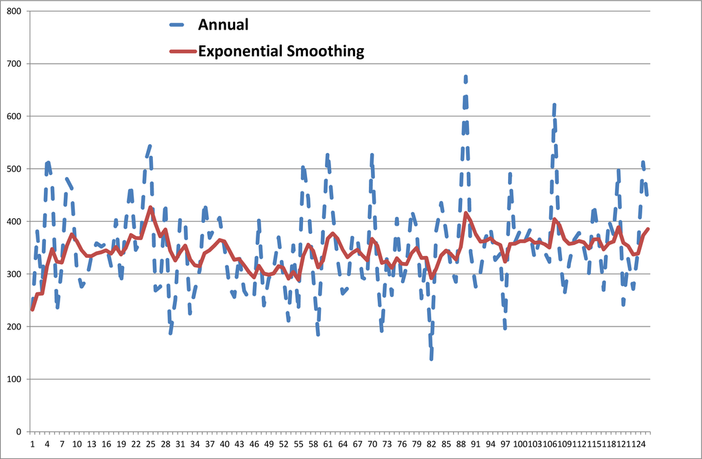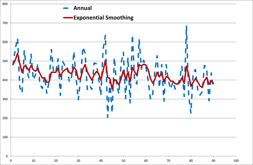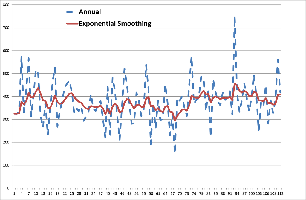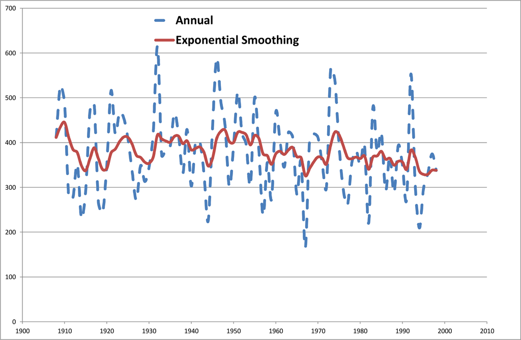 The question arises then as to whether, as these statements seem to imply, the rainfall has actually increased in the Cummins region over time. To begin the analysis, Figure 3 shows the annual rainfall totals for Cummins from 1915 to 2004. Later years were excluded because of missing months of data. Coincidentally, many of the latter years coincided with a severe drought and they may have only increased the idea of decline. Superimposed on the figure is the exponentially smoothed version of the rainfall totals constructed using
