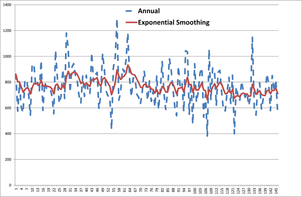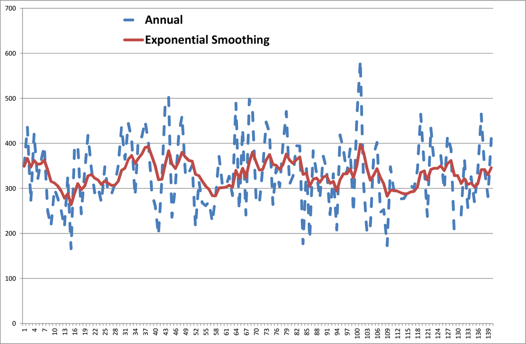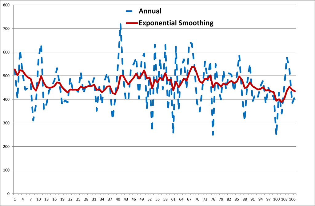 Annual rainfall totals for Minlaton, 34.77° S, 137.60° E, for 1880–2013. Note that exponential smoothing was not done for this location as there are some missing data.