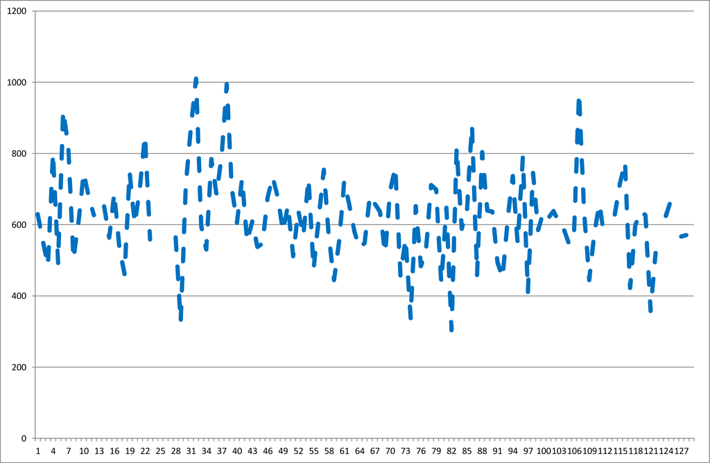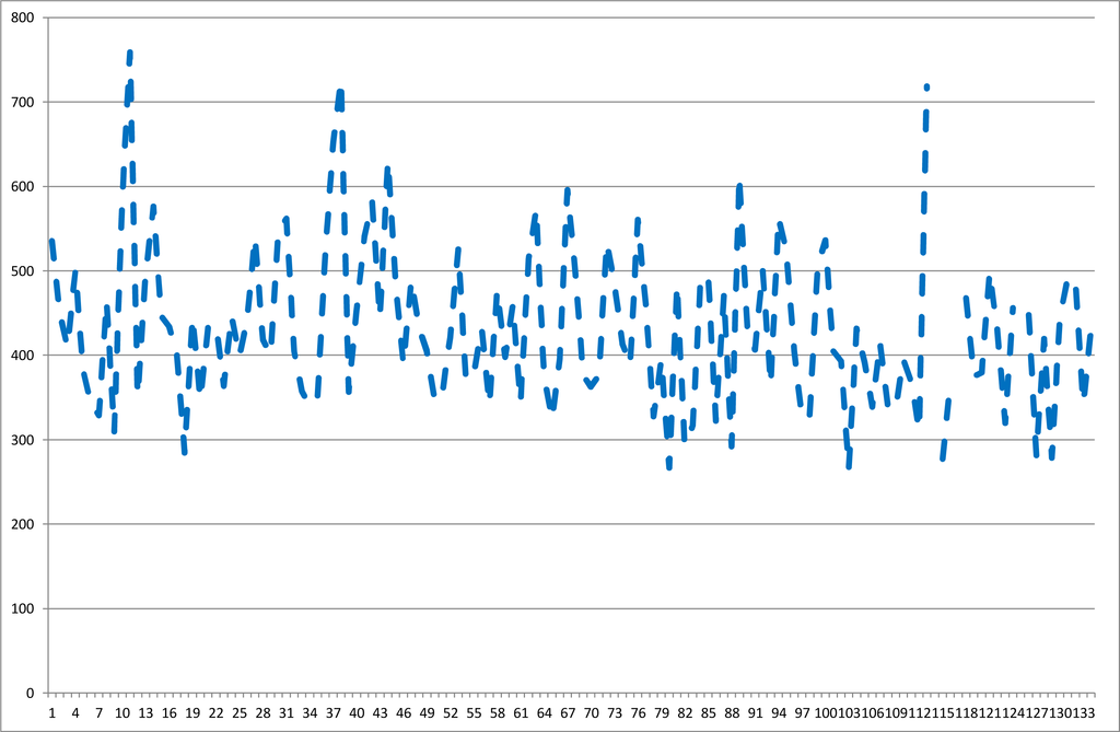 Let’s examine Murray Bridge rainfall over the whole period of record first. This is displayed in Figure 4. From this diagram, it appears that contrary to the conclusions in [6], the rainfall in latter years at Murray Bridge has either maintained the same level or indeed slightly risen. To test this premise divide the data into two sets, pre 1989 and from 1989 onwards. The mean rainfall before 1989 was 341 mm and 373 after. Then test the hypotheses.