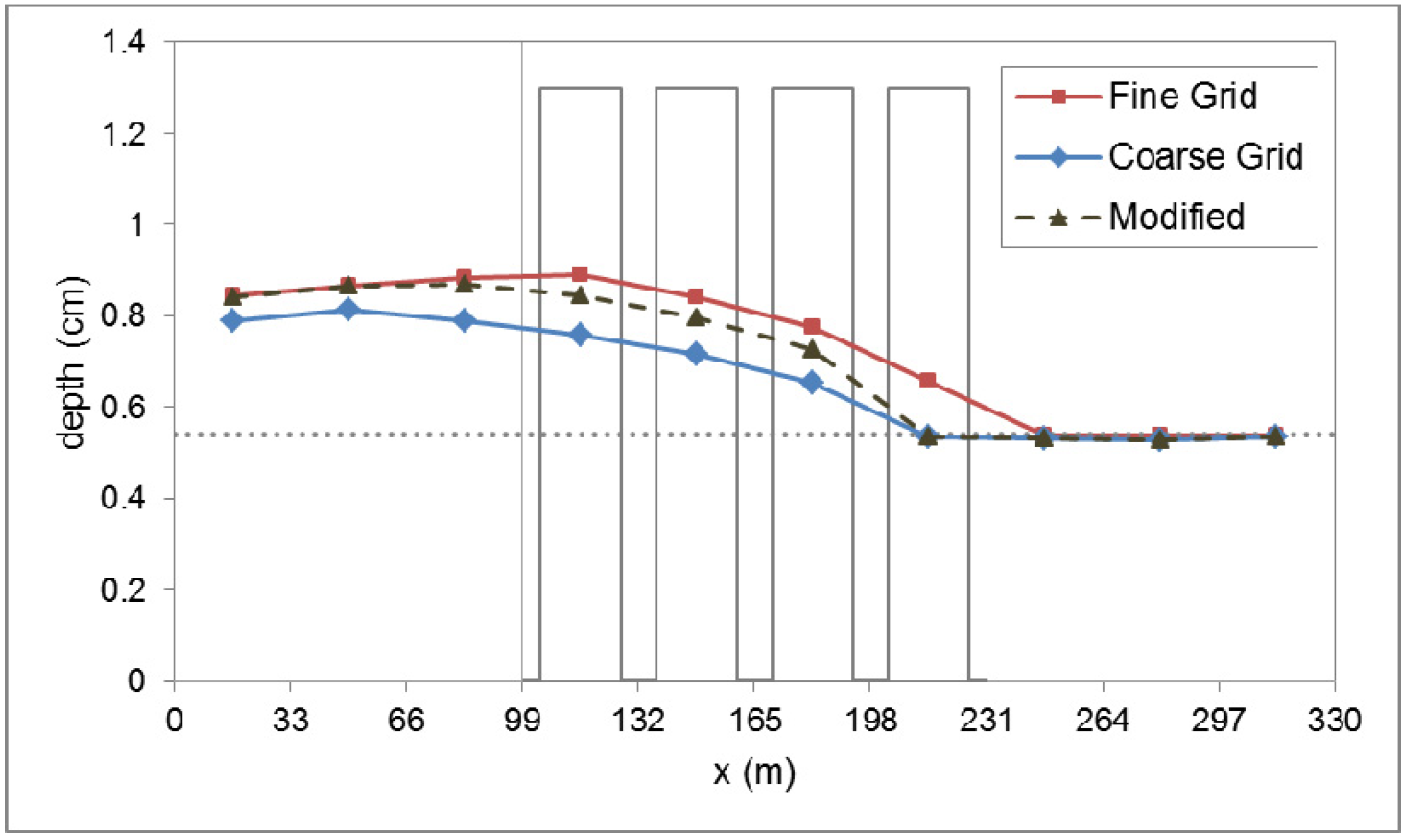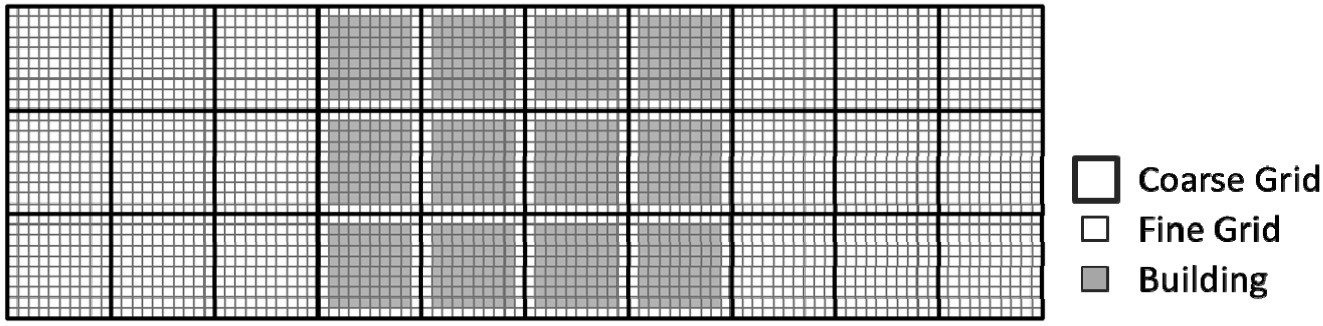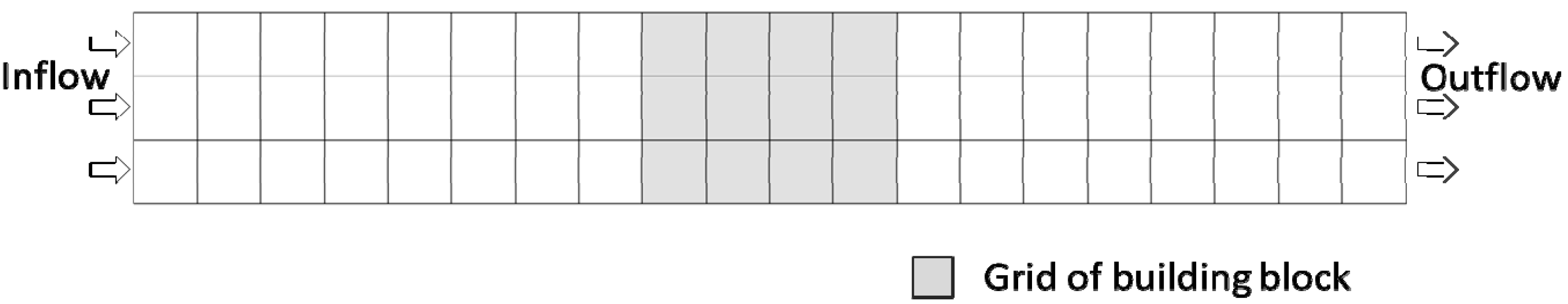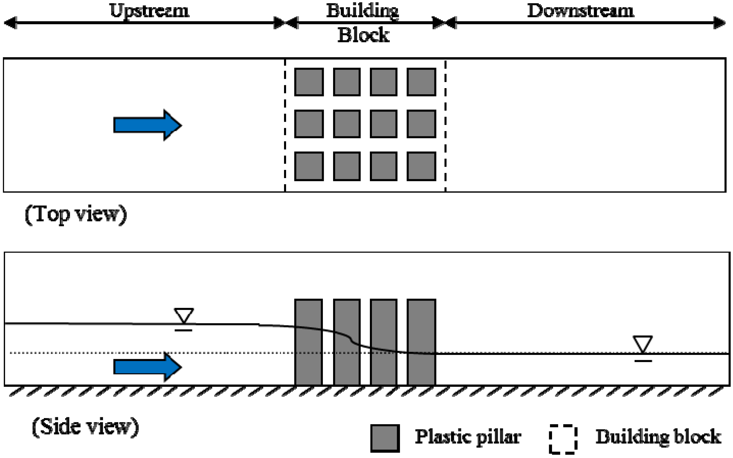 Due to scale differences between the experiment and urban areas, roughness corresponding to the blockage effect in Equation (14) was modified by scale adjustment to allow applications in urban inundation modeling.