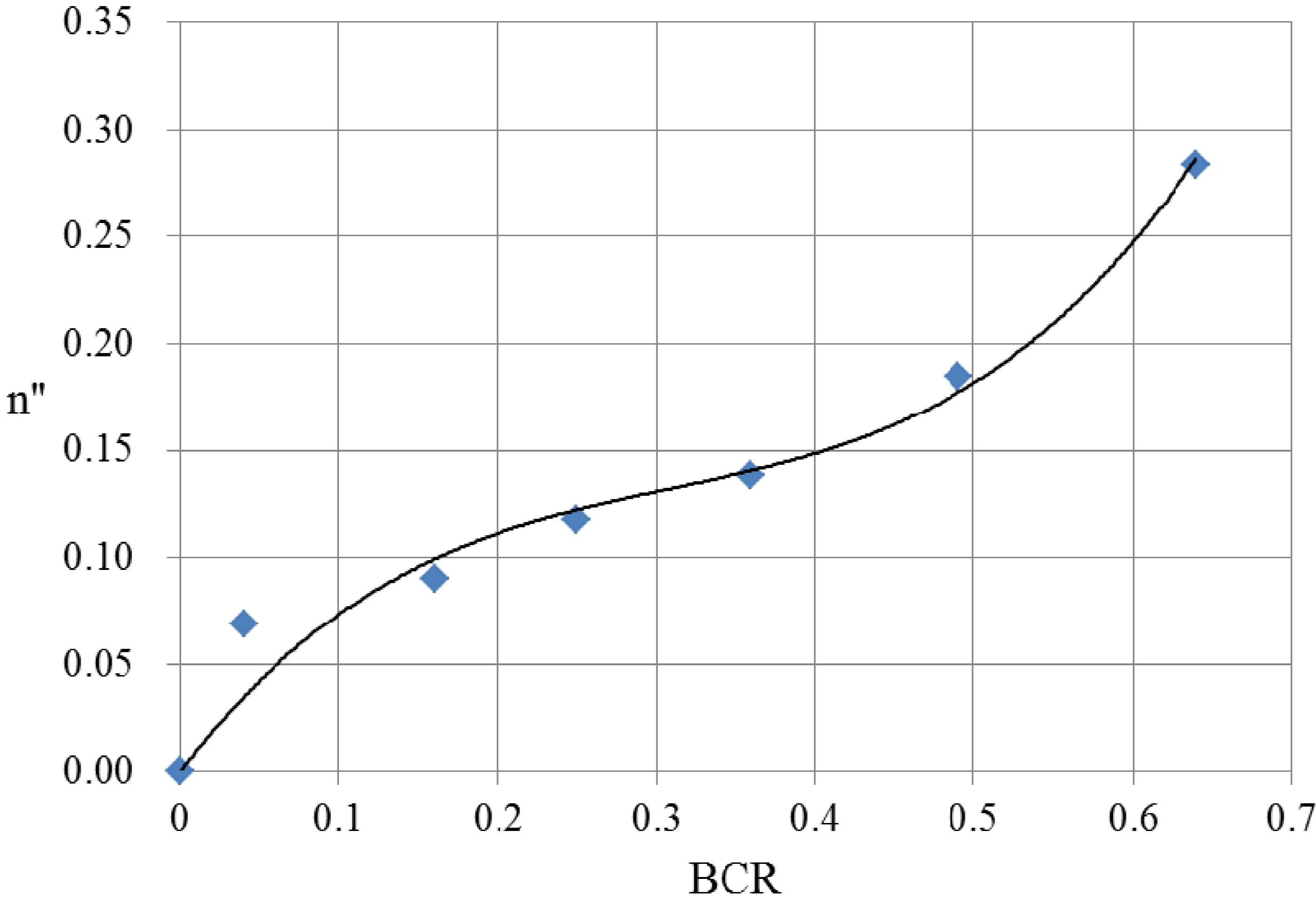 n increased mildly with BCR, but rapidly when BCR is greater than 0.45. The trend shows that surface resistance dominates the change of roughness when BCR is small. With increasing BCR, first roughness increased markedly and then, when BCR is close to 0.64, it remains approximately constant close to the value of 0.3. Further, this analysis indicates that BCR is the main factor influencing roughness for larger values of BCR.