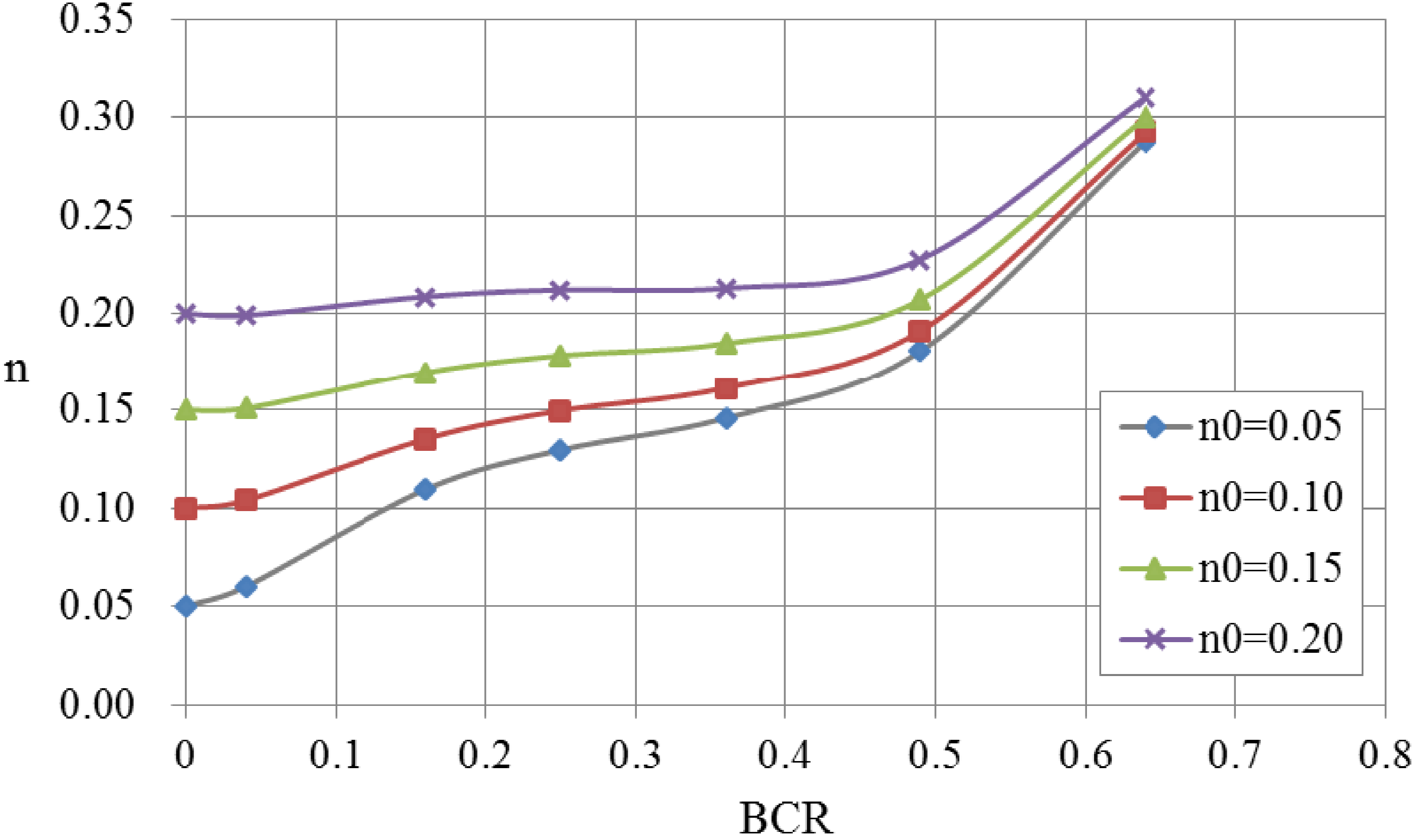 n0 and BCR were inputted into Equation (14) to observe the relationship of BCR and
