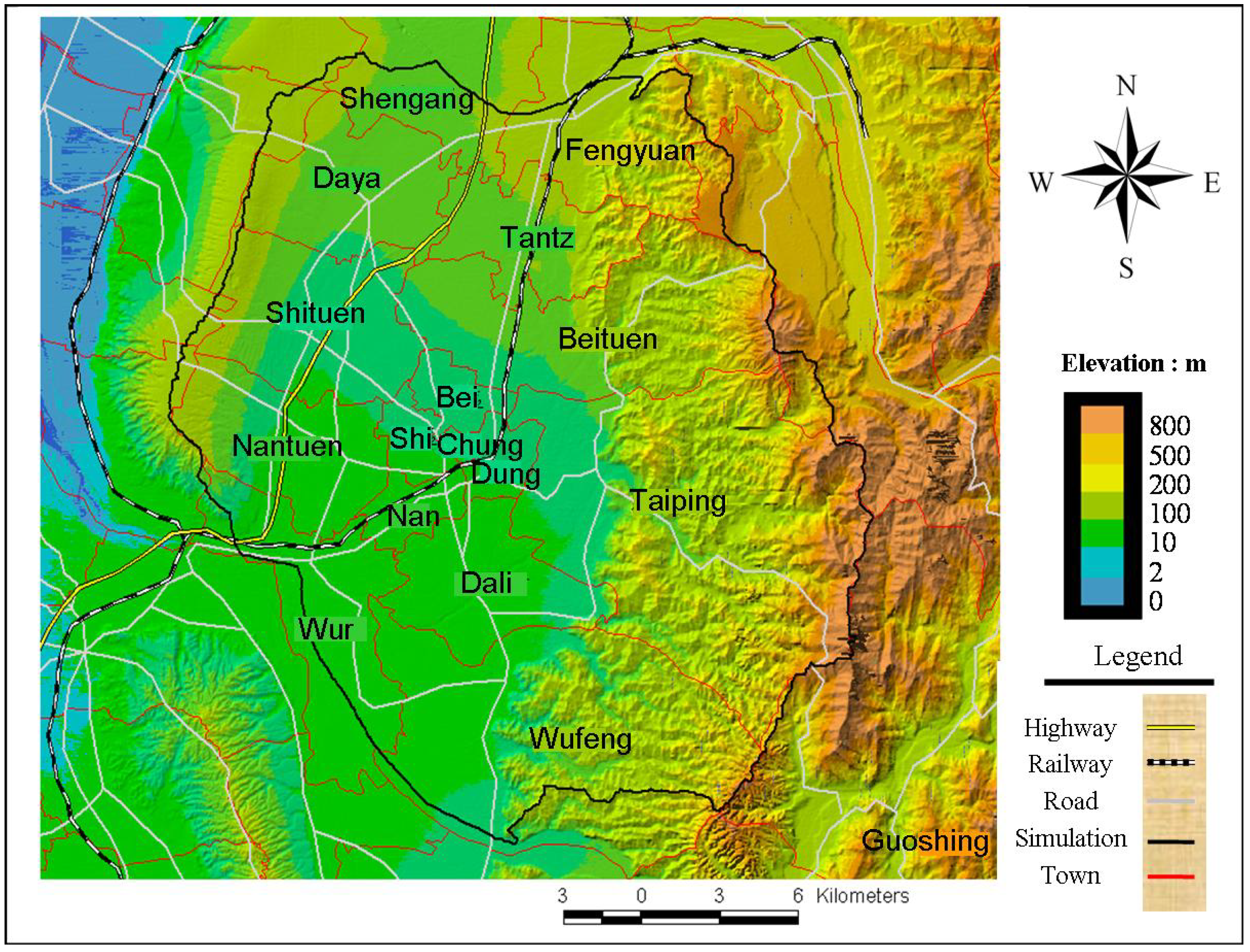 Figure 16 shows the topography and administrative borders of Taichung City. Taichung is a basin with the lowland in its southwest area. In the south, there are the Dali River and Wu River. The railway goes through the downtown, and the highway gets across the city along the Fazih River. The convenient traffic network consists of several importantly expressed ways, which encourage the centralization of the urban population.