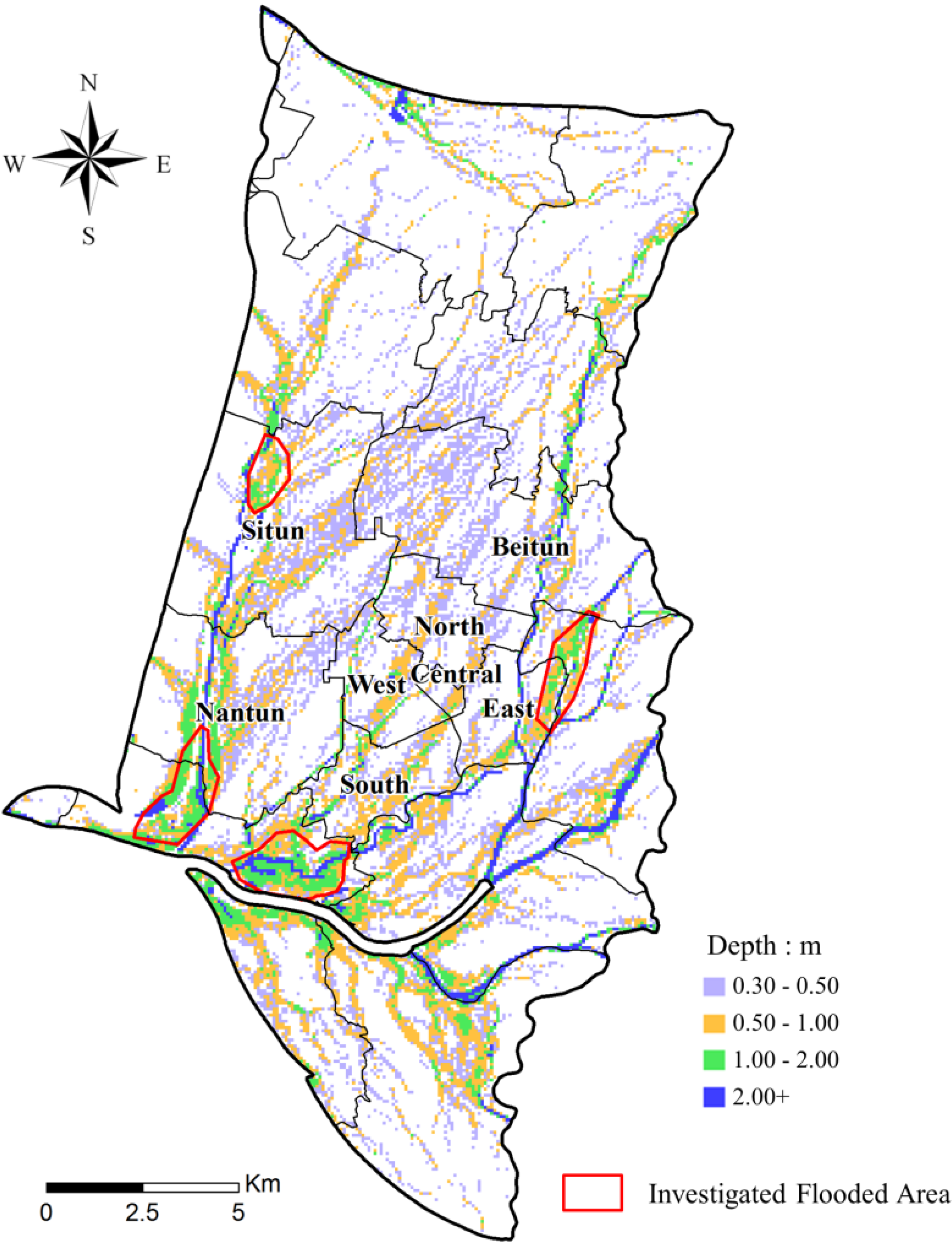 Figure 18 shows the simulated flooded area of Case 2 and investigated flooded area for Typhoon Kalmaegi surveyed by Taichung City Government. The torrential rainfall caused serious flood damage in Taichung city. The severe inundated area in Situn, Nantun, South, and East district can be simulated from the inundation model. The total inundation area was the summation of water depth above 0.5 m and shown in