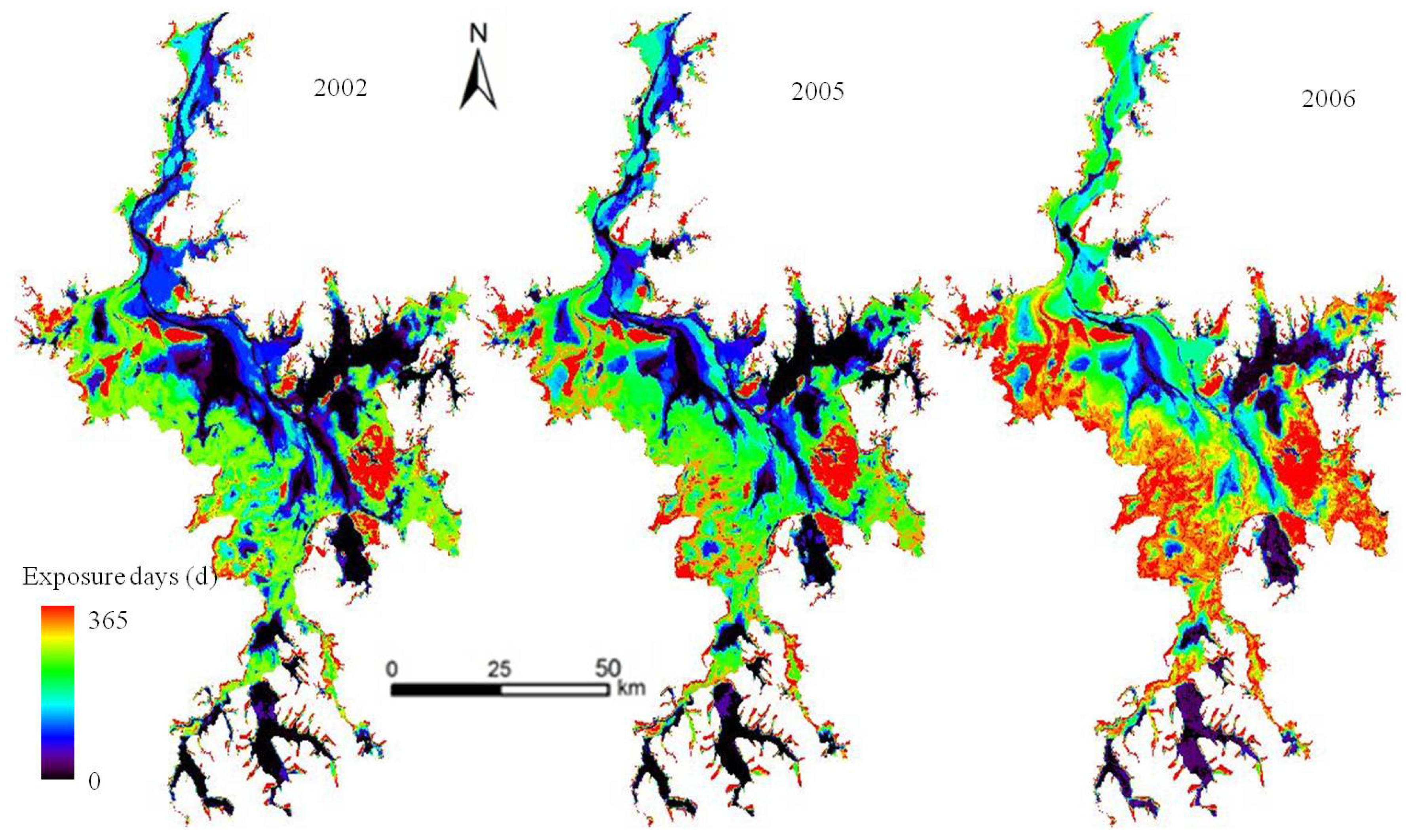 - Andreoli, R.; Yesou, Y.; Li, J.; Desnos, Y.; Shifeng, H.; de Fraipont, P. Poyang Hu (Jiangxi Province, PR of China) area variations between January 2004 and June 2006 using ENVISAT low and medium resolution time series. Geogr. Inf. Sci. 2007, 13, 24–35. [Google Scholar]