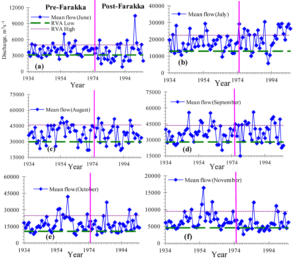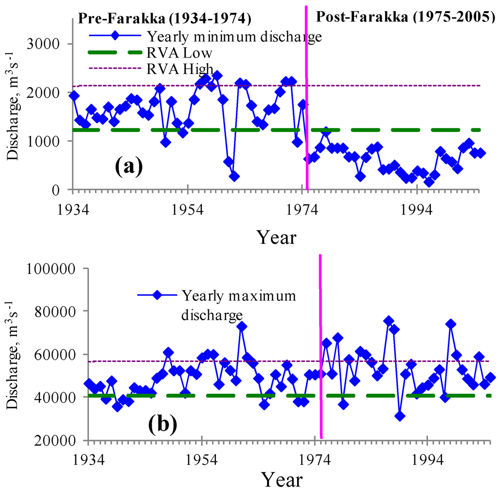 In order to overcome this gap, the objective of this study is to determine the threshold of the natural flow regime of the lower Ganges Basin and to investigate the hydrologic alteration of downstream flow in the Ganges River due to the construction of the Farakka Dam. In assessing the thresholds and evaluating the impact of the Farakka Dam, this study does not present any new approach. Instead, we apply the existing method of the RVA approach developed by Richter et al. [,] and applied by Pegg et al. [], Magilligan and Nislow [], Gain et al. [] and Jiang et al. []. The reason behind the selection of RVA approach is that the method is simple, but very much effective for policymakers. The analysis allowed us to provide insights on the impact of Farakka Dam on the hydrologic regime of the studied river basin. The assessment can be useful later for a broader assessment of impacts on local SESs. Moreover, the calculated thresholds may be used as a good basis for the negotiation with the riparian countries in the Ganges River Basin. This research is particularly relevant, as there are large global initiatives for trans-boundary river basin management.