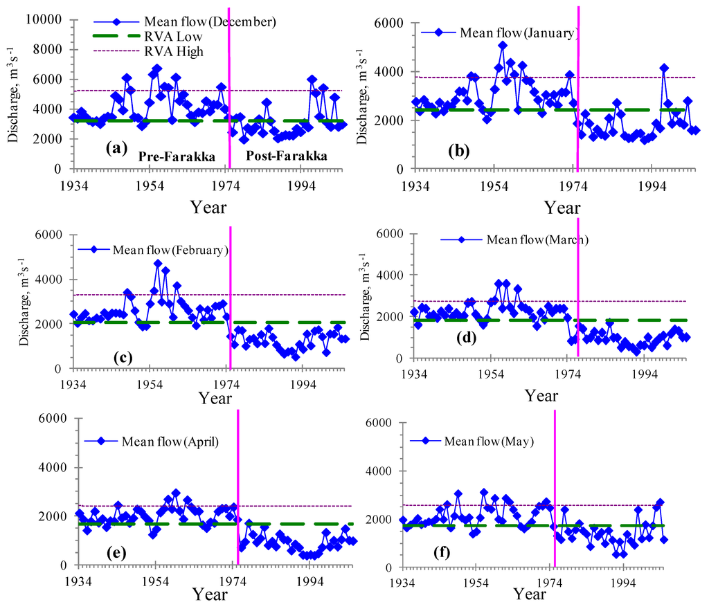 Our results have a number of policy-level implications for government agencies of the Ganges Basin. The calculated threshold flow of twenty-two RVA parameters can be used as initial targets for water resources and ecosystem management in the Lower Ganges Basin, particularly in Bangladesh. The government of Bangladesh and India could consider allowing human perturbation and development activities within the calculated threshold ranges. The calculated thresholds can also be used for water allocation to meet household, agriculture and industrial water demands. In trans-boundary river basin management within an integrated water resources management approach [,,,,,], thresholds of flow variability can be used as a basis for negotiation with other riparian countries. This simple, but effective, approach for evaluating the impact of dam-induced hydrologic alterations presented in this study may also prove to be useful to the policymakers and river basin authorities.