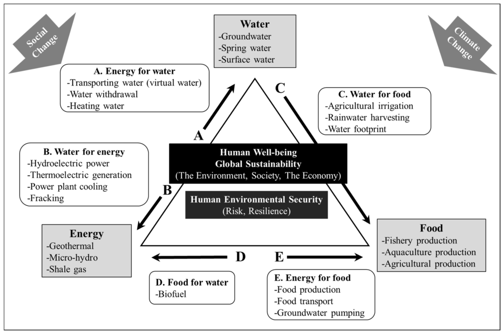 The concept of the water-energy-food (WEF) nexus emerged in the international community in response to climate change and social changes including population growth, globalization, economic growth, urbanization [], growing inequalities, and social discontent. These issues are putting more pressure on water, energy, and food resources, presenting communities with an increasing number of trade-offs and potential conflicts among these resources that have complex interactions. It is estimated that the global population will grow to 8 billion by 2025, 10 billion by 2050, and 11 billion by 2100 []. In terms of globalization, the traded percentage of food produced has grown globally from 10% in 1970 to 15% in 2000 []. The World Population Prospects estimates that 54% of the global population lives in urban areas, and that this proportion is likely to rise to 66% by 2050 []. Currently, some 1.1 billion people in the developing world do not have access to a minimal amount of clean water [], and 1.2 billion still live in extreme poverty [].