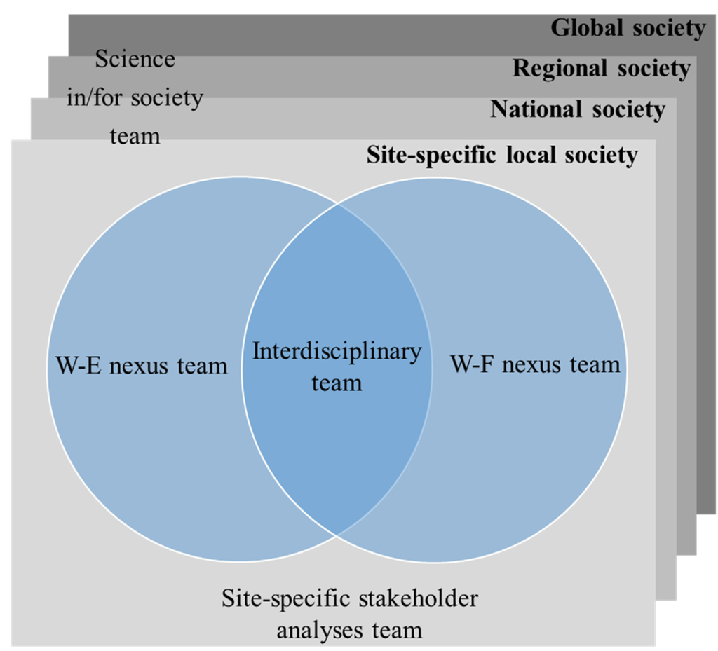 In this paper, we follow a framework for the interdisciplinary and transdisciplinary co-creation of new knowledge based on the concepts of co-design and co-production [], the goal being to link the ideas and actions of numerous stakeholders from various sectors. We consider different temporal and spatial scales, including vertical and horizontal dimensions, to achieve sustainable development based on the international research platform Future Earth 2025 Vision, which prioritizes eight key focal challenges. The WEF nexus is one of them, and Future Earth’s mission states “Deliver water, energy, and food for all, and manage the synergies and trade-offs among them, by understanding how these interactions are shaped by environmental, economic, social and political changes.”