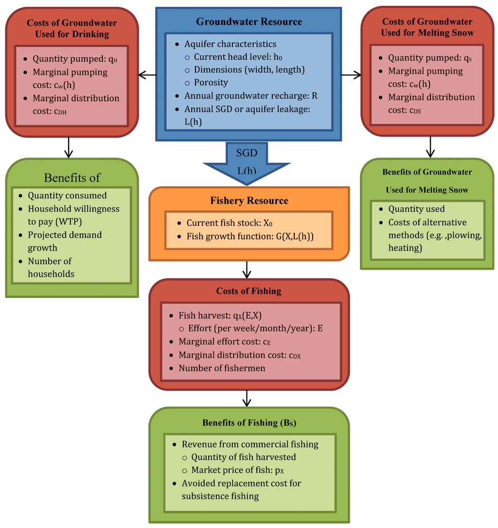 Figure A2 displays the general framework used to study Obama City’s optimal groundwater management. The central resource of interest in the framework is the groundwater aquifer, illustrated by the blue box in the center of the flow chart. Aquifer volume Xh(h) is a function of head level h, which will be changed via the controls (in red): groundwater quantity pumped for households qH at a cost of cw(h) and the quantity of groundwater pumped to melt snow qS, also at a cost of cw(h). Distribution costs for each use are given by cDH and cDS, respectively. The third control variable in the model is the quantity of fish caught qF, harvested at a cost of cF(XF). Aside from the aquifer state variable, this framework includes the fishery stock, given in orange by XF, which is governed by the growth function G(XF, h). In this framework, the primary stock of groundwater directly affects the growth of the fish stock via SGD, which is a function of head level SGD(h). Benefits for all uses of groundwater are shown in green: domestic benefits BH, snow-melting benefits BS, and fishery benefits BF.