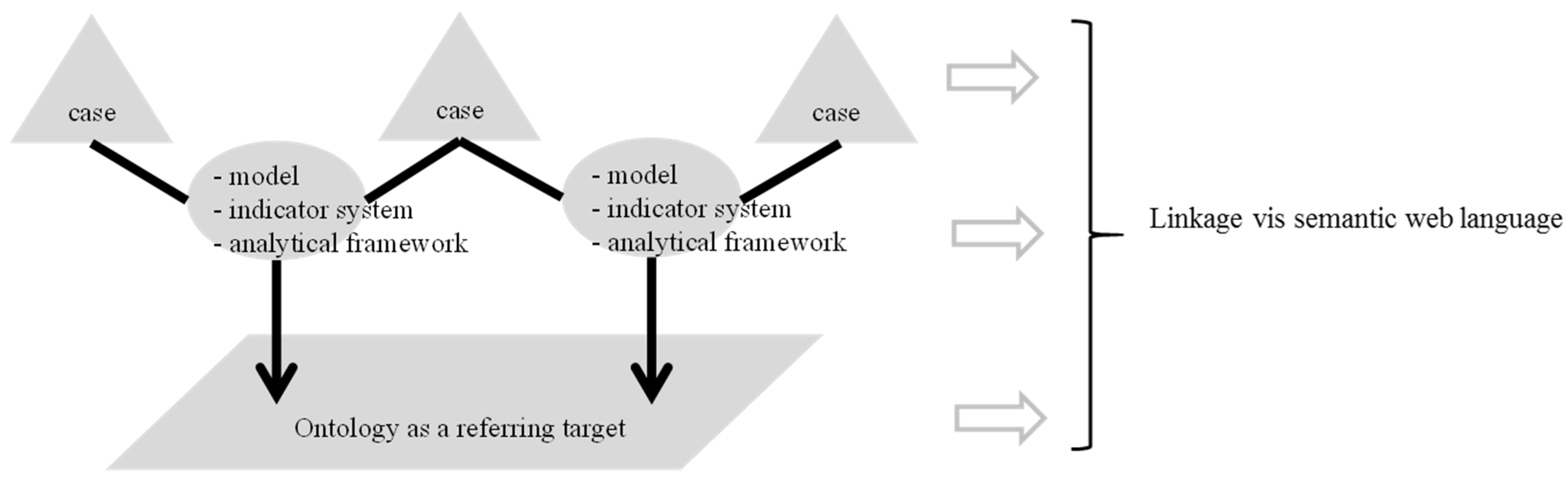 An ontology can deal with a model, an indicator system, or an analytical framework rather than a case itself. The main steps using an ontology are: (1) Sharing the definition of a term; (2) Sharing the relationship between items; (3) Sharing the relationship between models/indicator systems/analytical frameworks; and (4) Sharing the relationship between a defined term and a metadata item. The relationship between the WEF nexus model (
