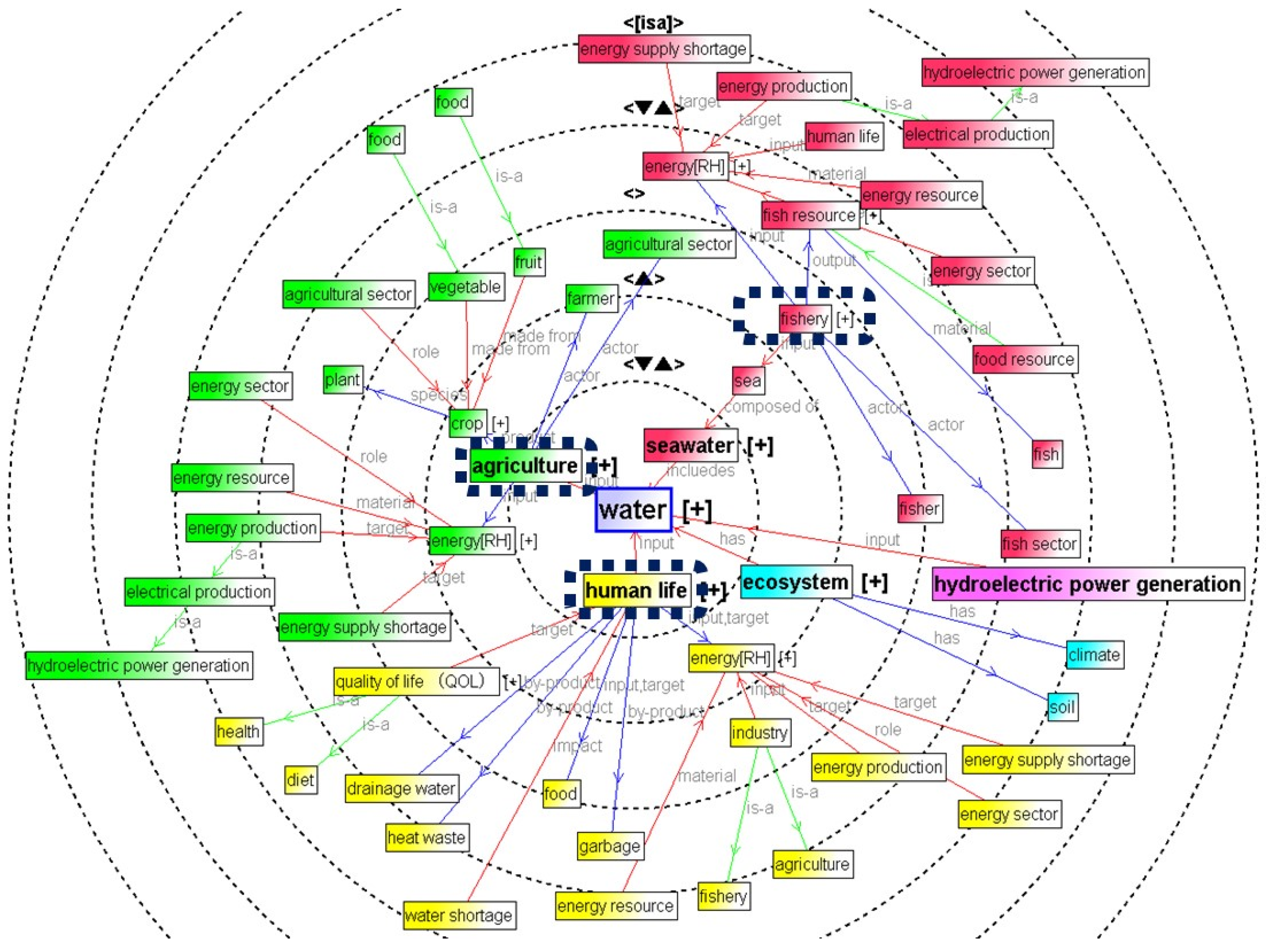 34]. This map shows that agriculture, fisheries and human life are the hubs that connect water, energy and food. By exploring the causal chains in the conceptual map, we can identify the question to be analyzed.
