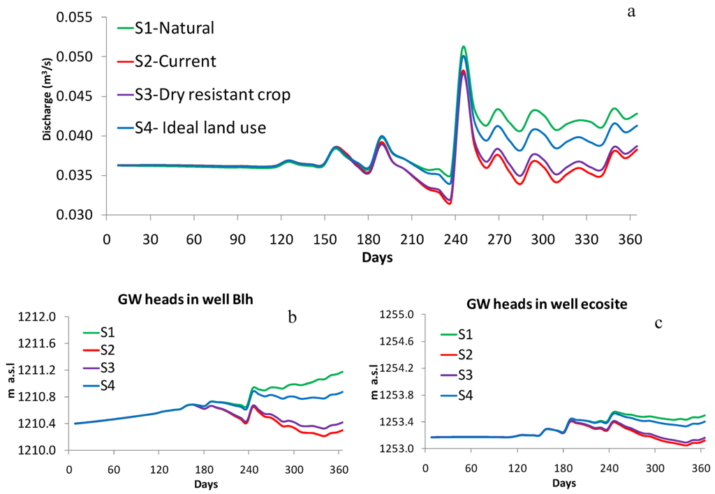 Simulated groundwater discharge to the Bulang River (a); and the calculated groundwater heads in well Blh (b); eco_site (c); well a (d); and well b (e) for four land use scenarios.