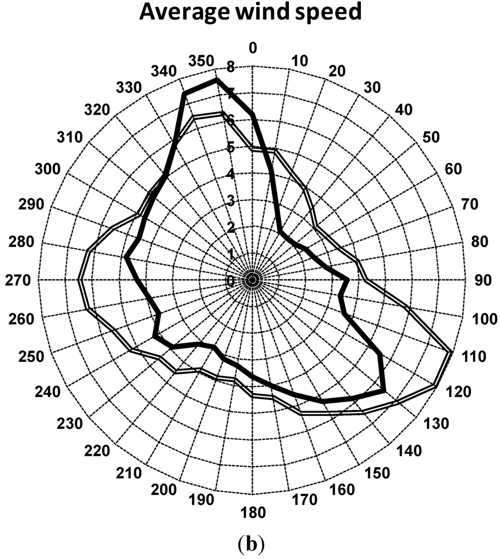 (a) Frequencies of wind (in %) with direction for the period 2002–2012, stations A (unfilled black line) and B (solid black line); (b) Average wind speeds (in m·s−1) with direction for the period 2002–2012, stations A (unfilled black line) and B (solid black line). Direction is defined as the direction from which the wind is blowing. The average wind speed is the mean value of wind speeds observed for each direction during the 2002–2012 period, without considering values of wind speed equal to zero.