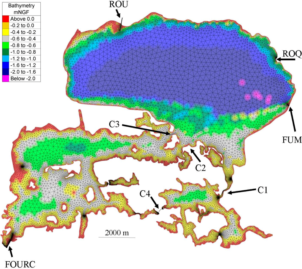 Unstructured mesh generated for the Vaccarès lagoon system, and resulting bathymetry. FUM and ROQ are the two drainage channels of Fumemorte and Roquemaure, and ROU is the Rousty channel. FOURC is the lagoon-sea connection at La Fourcade. For a water level in the Vaccarès lagoon system of 0.06 mNGF (mean water level in the Vaccarès lagoon system from 1993 to 2009) characteristics of C1, C2, C3 and C4 in terms of width and mean water depth are: C1 (width 32 m, mean water depth 0.77 m), C2 (width 273 m, mean water depth 0.38 m, C3 (width 129 m, mean water depth 0.40 m), and C4 (width 2 m, mean water depth 0.41 m).