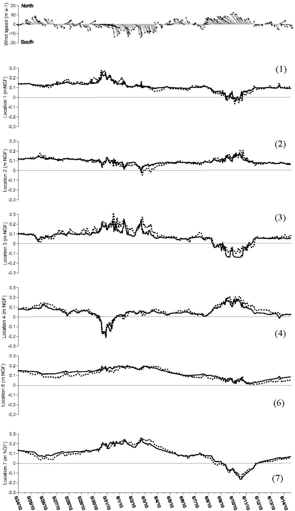 Measured wind vectors at the meteorological station B, measured and modeled water levels at locations 1–4, 6 and 7 (see Figure 1) from 24 May to 14 June 2010. Modeled water levels are shown with solid lines and measured water levels with dashed lines. Measured wind vectors at the meteorological station A are not represented for the sake of legibility of the figure.
