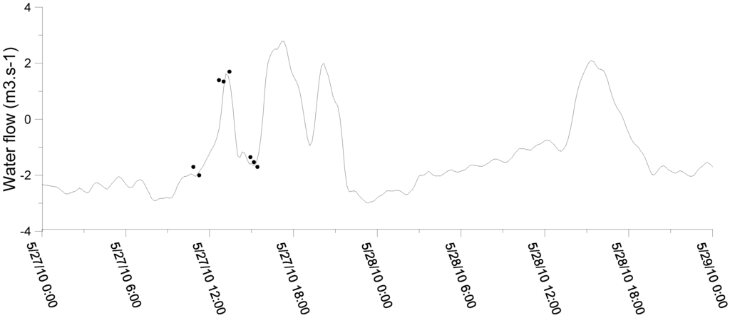 In addition, three gauging campaigns were conducted to measure water flows in several channels in the system: two campaigns in 2003 and 2010 in the channel between the Vaccarès and the Lion/Dame lagoons, and another in 2003 in one of the channels between the Vaccarès and the Impériaux lagoons (the most westerly), see Figure 1. The two gauging campaigns in 2003 were performed with an electromagnetic digital current meter (from OTT Hydrometry), and the campaign in 2010 with a surface mobile ADCP device, fixed on a small boat (OTT Hydrometry Qliner 2 ADCP Boat). The use of a surface ADCP in 2010 allowed us to perform faster measurements, in comparison with the electromagnetic digital current meter, limiting the risk of an inversion of the water flow in the channel during the measurement, due to a change in the wind direction.