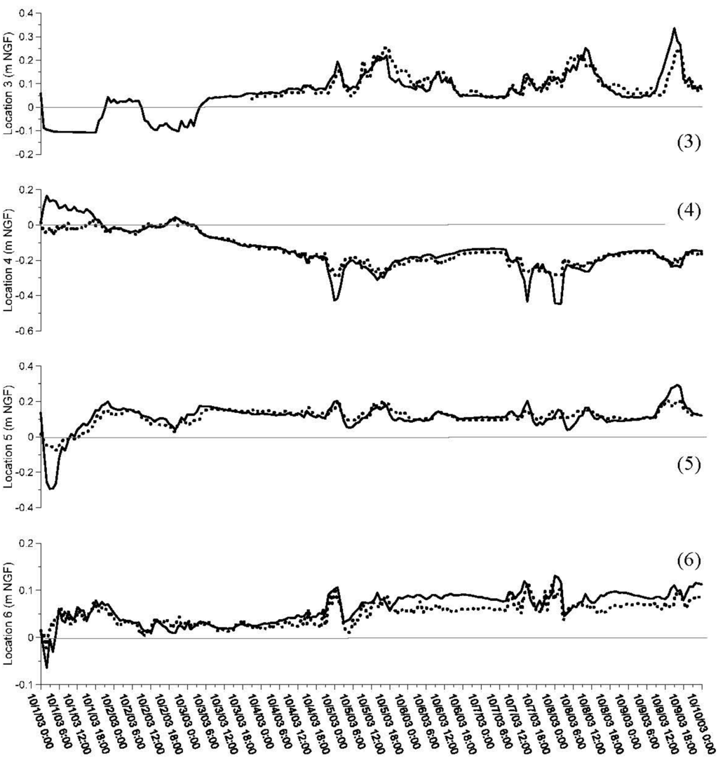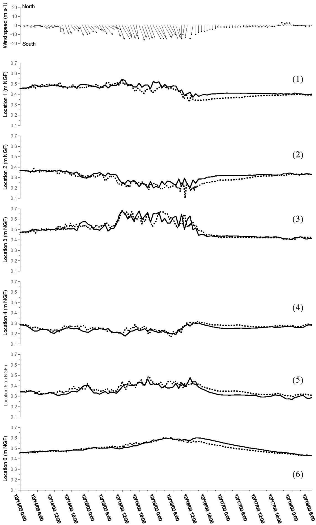 Measured wind vectors at the meteorological station B, measured and modeled water levels at locations one to six (see Figure 1) from 1 October to 10 October 2003. Modeled water levels are shown with solid lines and measured water levels with dotted lines. Measured wind vectors at the meteorological station A are not represented for the sake of legibility of the figure.