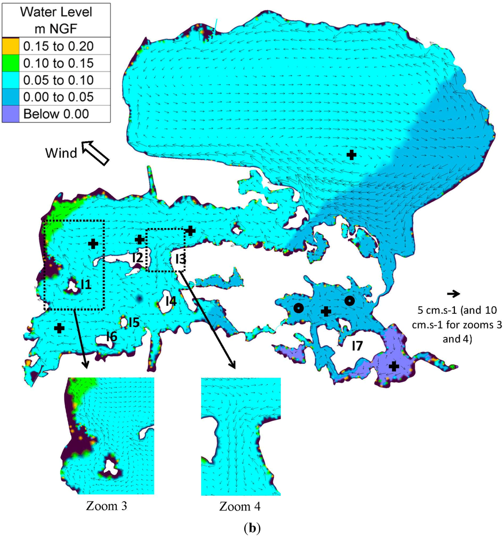 For the southeasterly wind, a current can be identified in the northern part of the Impériaux lagoon, where water flows overall towards the west along the north coast of this lagoon and along the shore of the island I3. Interestingly, the two north-south currents observed for the northwesterly wind (see Figure 8a), are again observed with inversed orientations. The first takes place along the western shore (western part of the island I1), where water flows overall towards the north, with low counter flows towards the south along the east coast of this island (see zoom 3). The second current is observed in the area between the islands I2 and I3: water flows overall towards the south in the central deeper area between I2 and I3, with low counter flows towards the north in the higher parts of this area (mainly situated along the western shore of I3, see zoom 4).