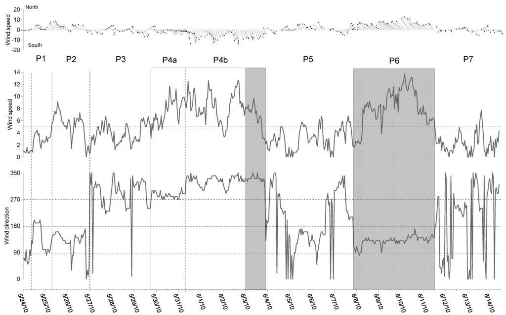 The following period, from 29 May to the end of 3 June (P4a and P4b in Figure 9, identified by the first gray box), is characterized by northwesterly winds. For this period, the wind speed is mostly faster than 5 m·s−1. Two sub-periods can be identified in period 4, the first one (P4a in Figure 9), from 29 May to 31 May with a wind direction close to 280°, and the second one, from 31 May to the end of 3 June (P4b in Figure 9), with wind directions close to 330°.