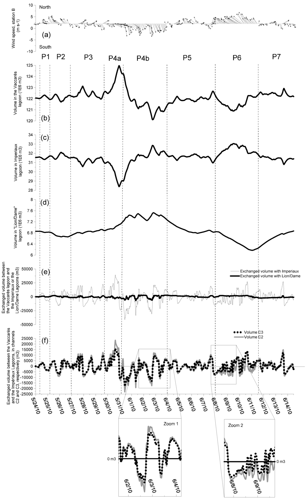 An interesting point concerns the two maximum volumes in the Impériaux lagoon, which are observed for periods P4b and P6. Interestingly, these two maxima are observed for northwesterly winds in one case (period P4b) and for southeasterly winds in the other (period P6). For the northwesterly winds, water flows into the channels C2 and C3 (see Figure 3) are both from the Vaccarès lagoon into the Impériaux lagoon (see Figure 10f, zoom 1), explaining the relatively fast increase in the volume of the Impériaux lagoon. For the southeasterly winds, water flows in C2 are always from the Vaccarès lagoon into the Impériaux lagoon, whereas water flows in C3 are sometimes from the Impériaux into the Vaccarès lagoon, and sometimes from the Vaccarès into the Impériaux lagoon (see Figure 10f, zoom 2). This explains the slower increase in the volume of the Impériaux lagoon, compared to period P4b (see Figure 10c).