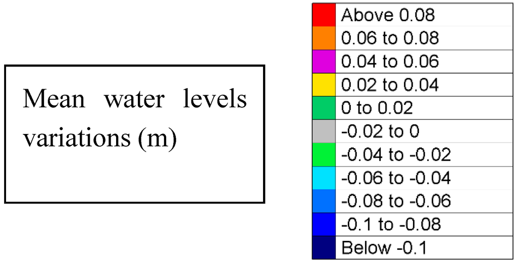 Globally, for periods P1 and P2, there is a decrease in the water levels in the Lion/Dame lagoon. This increase is more pronounced for period P2, due to the higher wind speed (average wind speed is 5.6 m·s−1 for P2, and 2.3 m·s−1 for P1). In addition there is globally a decrease in the water levels in the southeast of the Vaccarès lagoon and of the Impériaux lagoon. Due to the small wind speed, the mean variations observed are not high (range from −0.04 to 0.02 m).