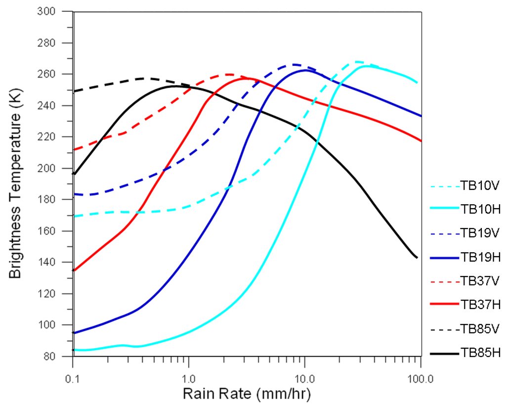 Ideal plot of brightness temperature (TB) versus rain rate (RR) over the ocean for the Tropical Rainfall Measuring Mission Microwave Imager (TMI) channels [35]. The text in the right side of Figure 1 describes the frequency and polarization of TMI which correspond to each line.