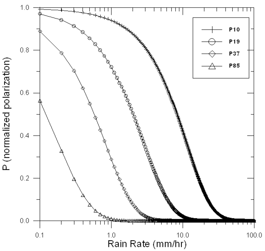 Relationship between attenuation index and RR for TMI channels [35]. The P10, P19, P37, and P85 in Figure 2 indicate the attenuation index at 10, 19, 37, and 85 GHz of TMI.