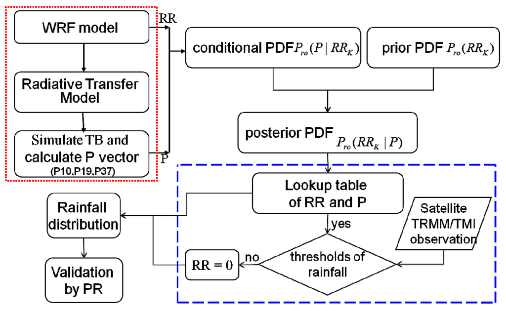 Nine years of near-surface RR data were used to construct the prior PDF, and the WRF model was used to simulate the vertical hydrometeor distribution and surface RR for 15 typhoons and to calculate the P value, which was then simulated using the RTTOV model; subsequently, the conditional PDF was constructed. Finally, According to Bayesian theory, the posterior PDF derived from the prior and conditional PDF, and the posterior PDF could be used along with satellite observations to estimate the RR associated with a typhoon. In other words, the rain rate of typhoon was estimated by inputting the vector into the lookup table (posterior PDF). The physical meaning is that the probability distribution of the RR is estimated using a certain known observation vector .