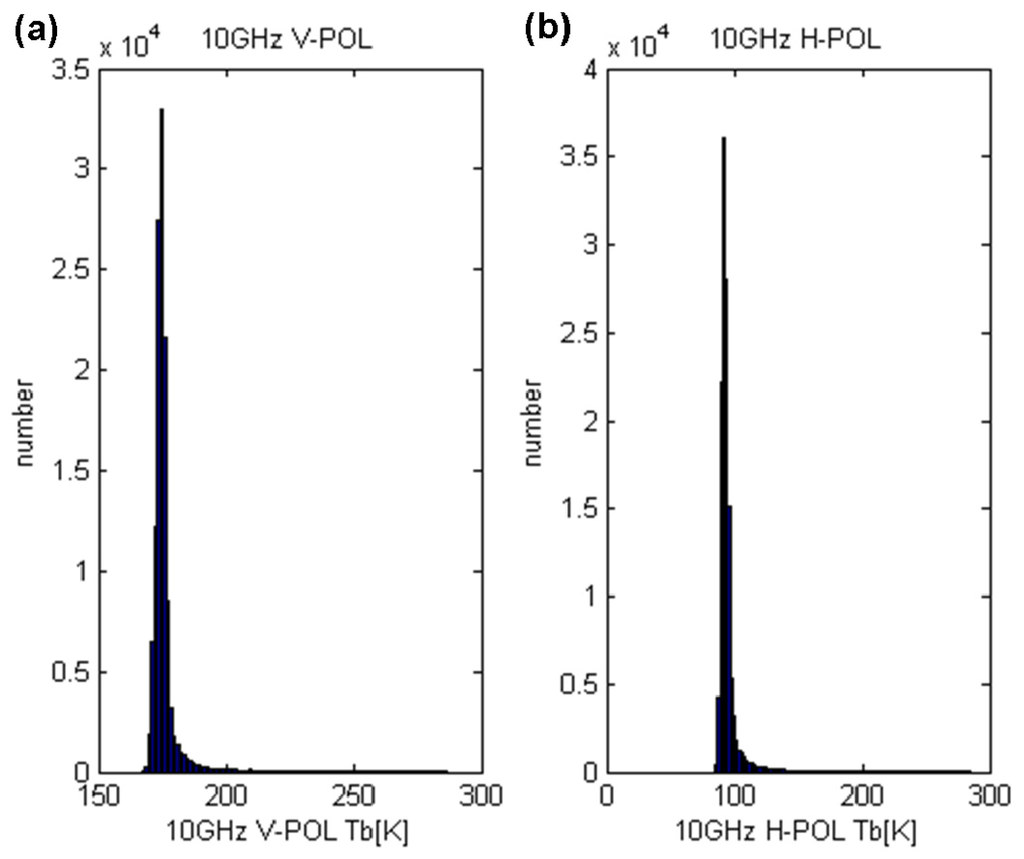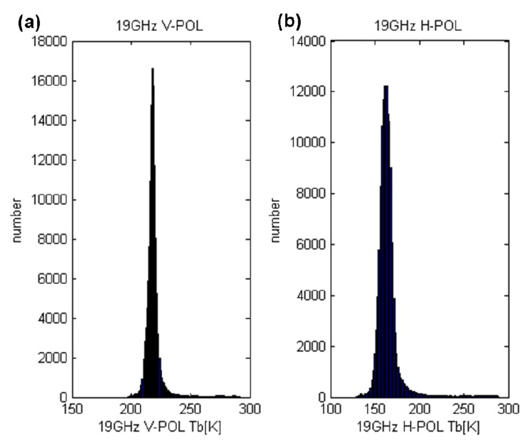 Histograms of the TB for the TMI in the absence of rain at 19 GHz: (a) TB10V and (b) TB10H.
