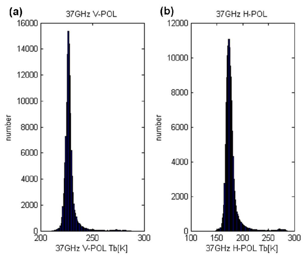 Histograms of the TB for the TMI in the absence of rain at 37 GHz: (a) TB10V and (b) TB10H.