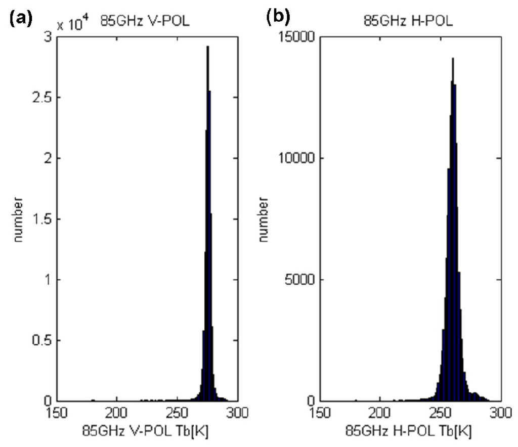 Histograms of the TB for the TMI in the absence of rain at 85 GHz: (a) TB10V and (b) TB10H.