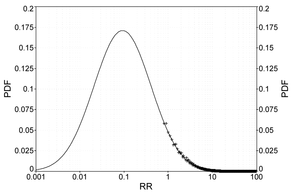 The symbol “+” in Figure 9 is used to represent the RRs near the nadir of the curve. The x coordinate represents the RR, and the y coordinate represents the prior PDF. The solid line represents the probability distribution obtained by fitting a logarithmic normal distribution to the portion of the curve marked by “+” symbols.