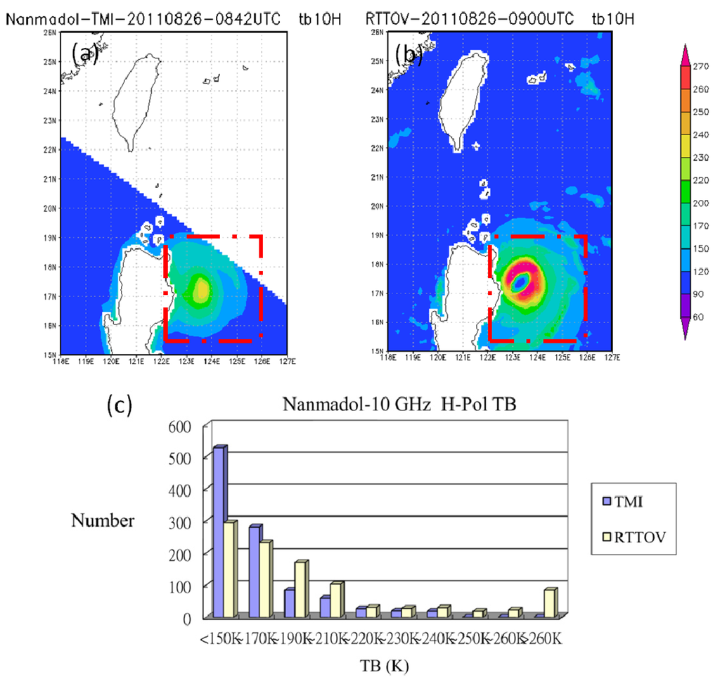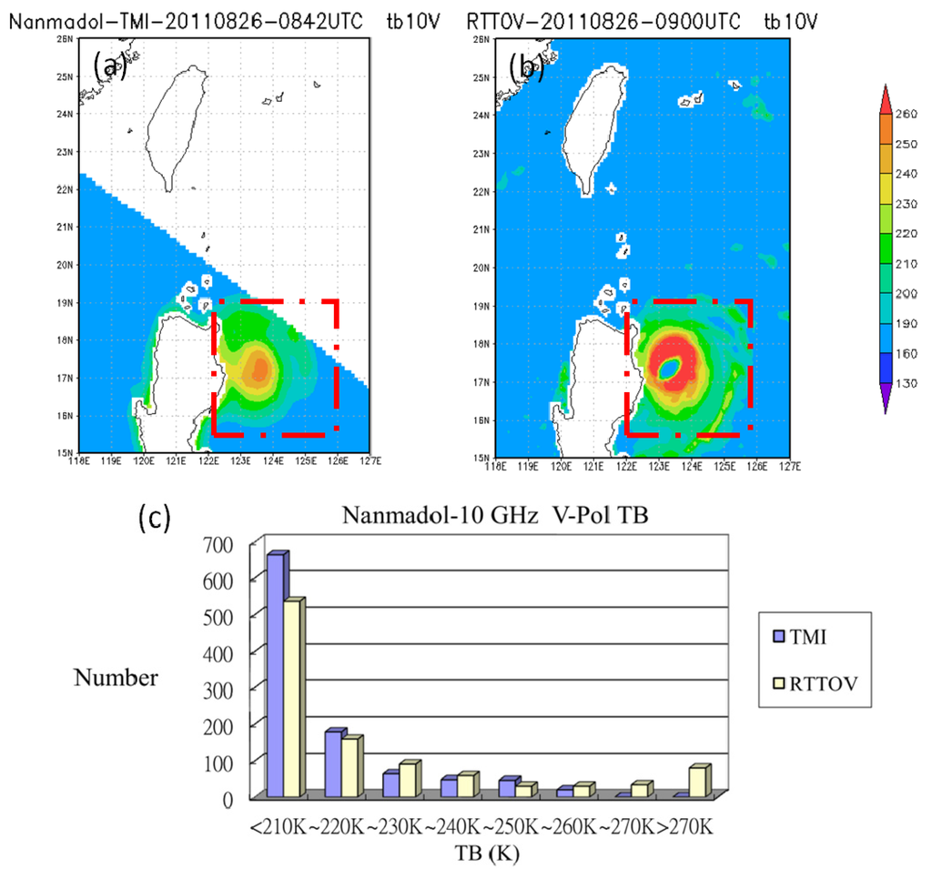 TB10V of Typhoon Nanmadol: (a) TMI observation; (b) Radiative Transfer for TIROS Operational Vertical Sounder (RTTOV) simulation; and (c) histogram for the region within the dashed square in the preceding panels.