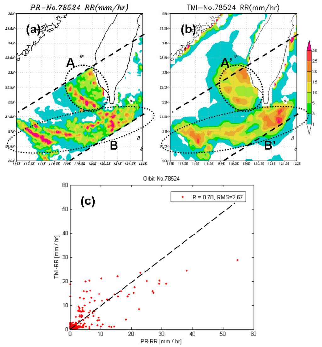 Figure 13 shows the estimated precipitation for typhoon Nanmadol. Figure 13a shows the RR estimated by the PR (hereinafter referred to as PR-RR), Figure 13b shows the RR estimated using the Bayesian method developed in this study (hereinafter referred to as TMI-RR), and Figure 13c shows a scatter plot of both types of estimates. In Figure 13a, typhoon Nanmadol consists of two regions with heavy precipitation. Region A is the southwestern sea area of Taiwan, and region B extends from the Bashi Channel to the southern part of the Taiwan Strait. In Figure 13b, the regions with heavier precipitation are located in regions A′ and B′, which match the locations of regions A and B in Figure 13a. Further analysis of Figure 13a,b regarding the intensity and range of heavy precipitation shows that the maximum PR-RR is higher than the maximum TMI-RR and that the range of the second greatest precipitation (yellow parts, 10–25 mm·h−1) of the TMI-RR is greater than that of the PR-RR.