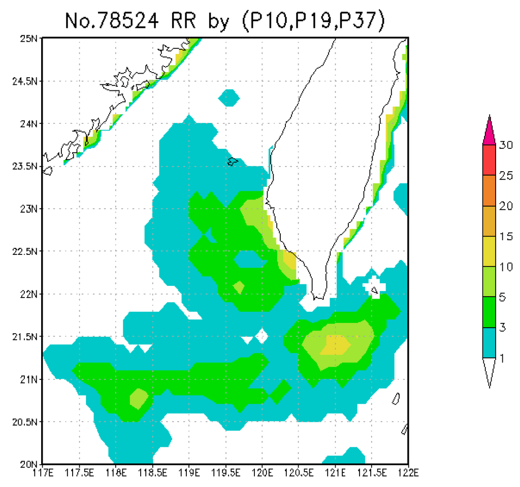 The main difficulties are constructing the prior and conditional PDFs [38] and obtaining numerous and distinct samples to extend the distribution range of the P value and RR. The objective of this study was to estimate the RR associated with typhoons that may impact Taiwan. Therefore, near-surface RR data were collected by using the PR for a nine-year period (2002–2010), from June to November, over the northwestern Pacific and South China Sea regions (longitude 110°–155° E, latitude 5°–35° N), and the data were used to construct the prior PDF.