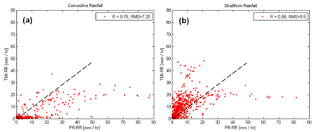 Scatterplot of TMI-RR and PR-RR for (a) convective rainfall and (b) stratiform rainfall.