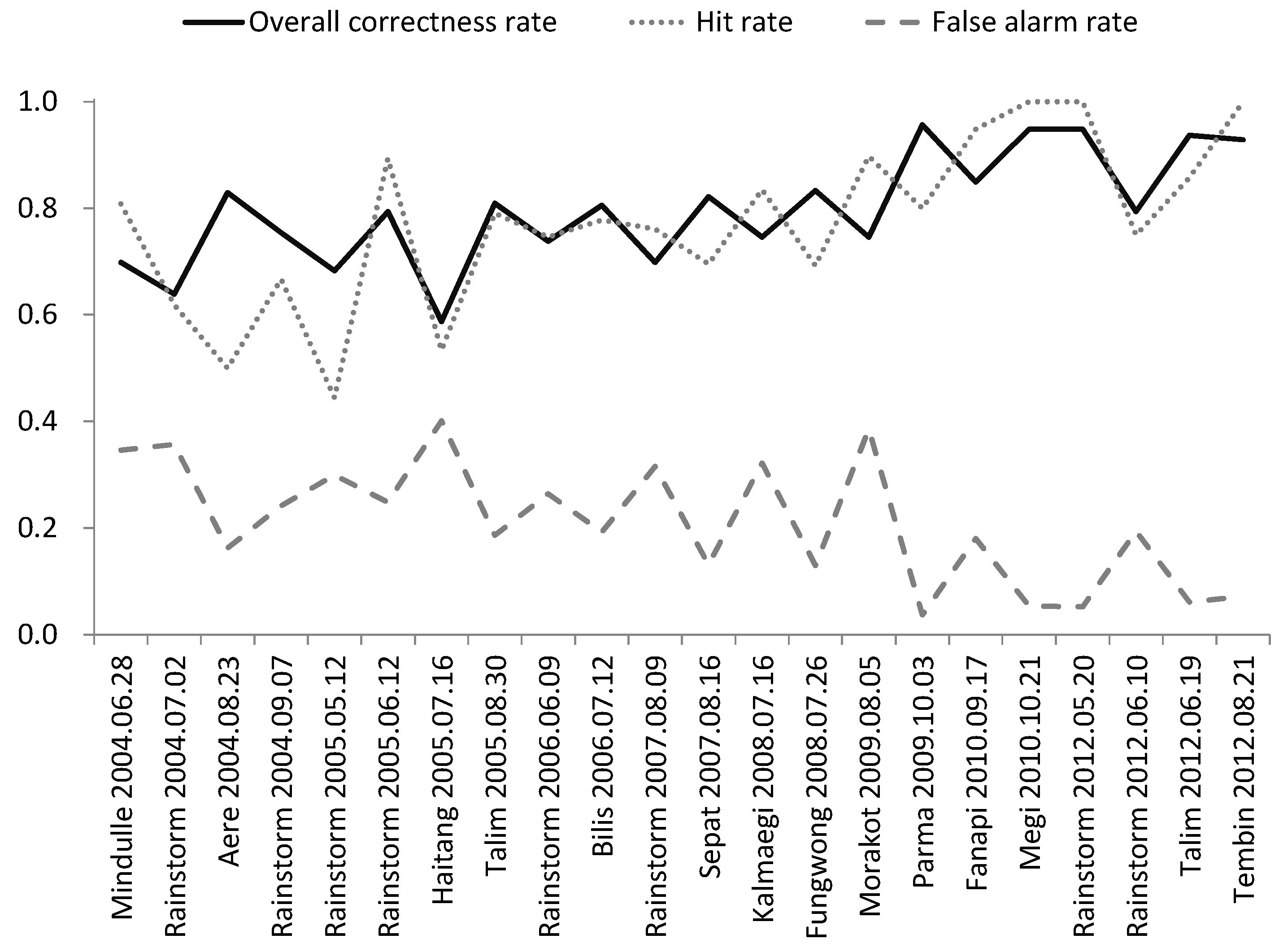 | Typhoon Morakot | 105 | 12 | 52 | 83 | 0.90 | 0.39 | 0.75 |