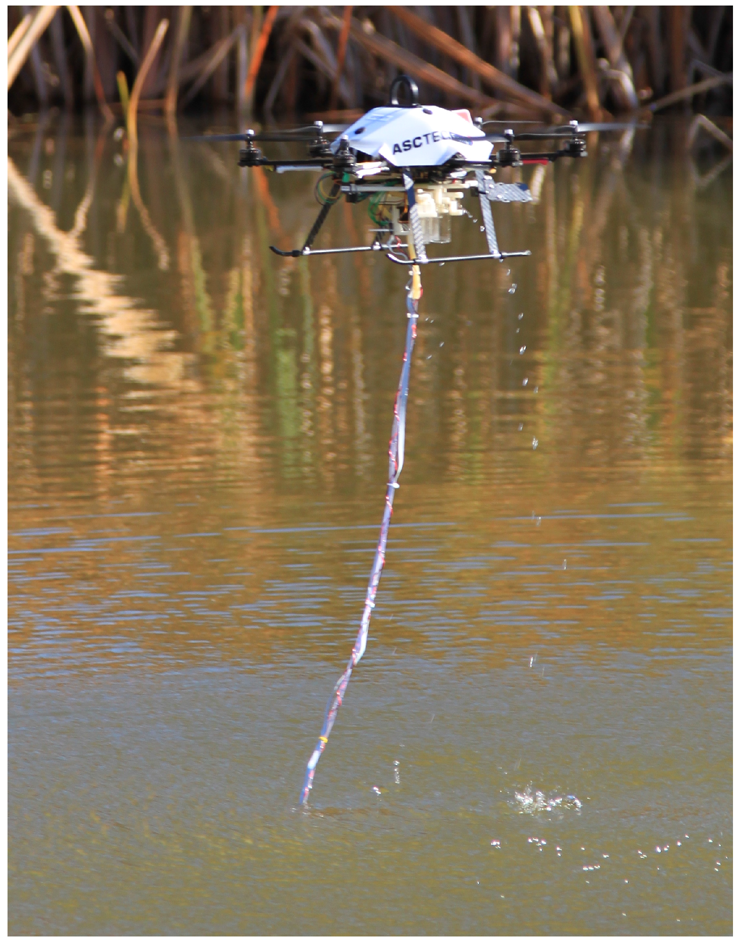 To make measurements, the UAS hovers above the water surface, and the tube is extended through the water column. Varying water depths can be sampled either by changing the length of the tube that is extended into the water column or by changing the UAS altitude with a fixed length of tube extended. For each flight, the data from the UAS’s pressure-temperature system are transmitted from the UAS to a laptop ground station, where it is time stamped and written to a data log along with the UAS’s GPS coordinates and altitude.