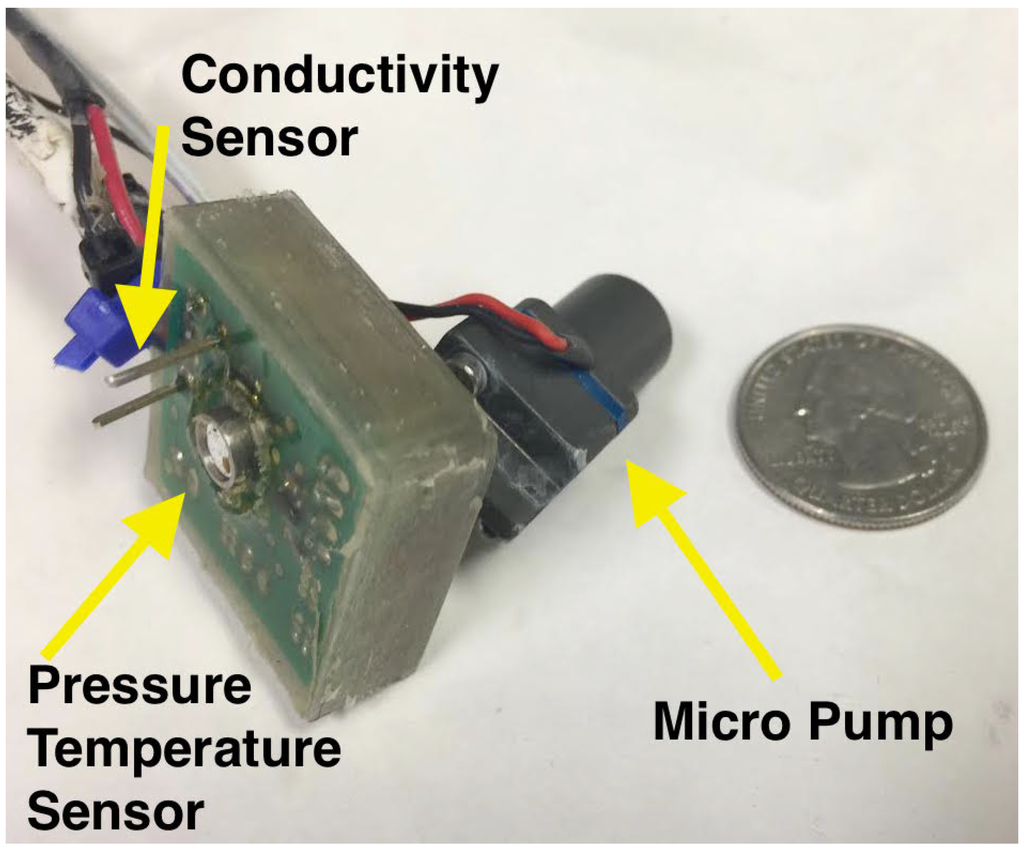 To facilitate the use of the UAS for freshwater ecology, we augmented the base platform with several sensors and subsystems [34]. Most importantly, we added multiple downward-facing ultrasonic rangers (Maxbotix MB1240-EZ4: ±1-cm accuracy within 2 m) to improve altitude estimation over water and thus provide better flight elevation control. To enable sensing within the water column, we attached a custom-built pressure-temperature embedded sensor system to a 4-m tube, which terminates in a pump, allowing water samples to also be made with the same system. A basic conductivity sensor is also attached to the end of the tube, allowing a direct indication of whether it is submerged or in air. This is primarily a safety feature to protect the pump and to ensure that it is submerged before pumping. A schematic of the system is shown in Figure 2, and the sensor specifications are provided in Table 1. During flight, the tube is reeled into the UAS, using a thin thread that runs through clips. The clips are attached to the tube at 0.75-m intervals, and the tube is retracted by spooling the thread beneath the UAS, causing the tube to coil below the vehicle. A long length of tube can become entangled in the environment, and its swinging motion during flight can induce dangerous and unstable flight dynamics. Therefore, the spooling mechanism reduces the hazards associated with flying with an object attached to the UAS.