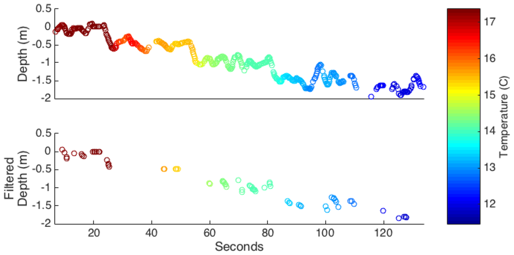 We filtered the temperature data because unintentional altitude changes in the UAS during flight result in the temperature sensor moving periodically up and down 25 cm through the water column. This movement causes multiple temperature readings to be associated with a given target depth and is problematic because the thermal response time of the MS5803 sensor is long compared to the rate of vertical movements. On average, the sensor requires 90 ± 45 s to converge to 90% of the actual temperature (the temperature response time of the sensor system is slowed due to polyurethane waterproofing that protects the electronics). To avoid erroneous data associated with these long equilibration times, we filtered the temperature data based on the joint rates of the change of pressure sensor depth and temperature. Specifically, we excluded temperature readings when either temperature or depth changes quickly: or . These thresholds were determined by visually inspecting plots of the temperature and depth rates of change and observing that during periods of minimal change, nearly all values are bounded by the aforementioned thresholds. As shown in Figure 4, this filtering method retained 15% of the original readings and discarded most readings from the descent periods between the five measurement points in the water column.