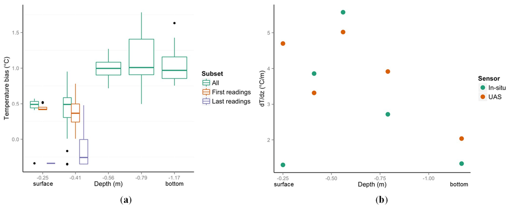 Comparison of UAS-borne and in situ temperature sensors, including logged data and detected thermal gradient. (a) Bias in temperature measured at each depth; (b) comparison of the derived temperature gradient at each depth.
